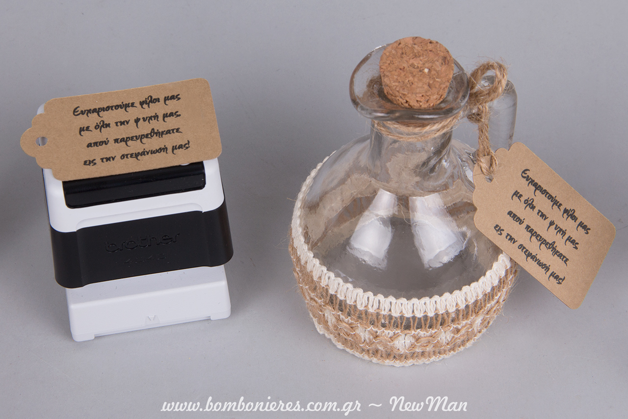 Η Λίλιαν Νιούμαν δημιούργησε αυτό το υπέροχο ευχαριστήριο κρητικό κέρασμα έχοντας στη διάθεσή της τα πιο απλά υλικά: κανατάκι γυάλινο με φελλό (φ. 6 x 12cm), κορδέλα λινάτσα σε εκρού φυσικό, Eco Brown ετικέτες (32 x 52mm), κορδόνι γιούτα ψιλό και σφραγίδα Brother με μαντινάδα.