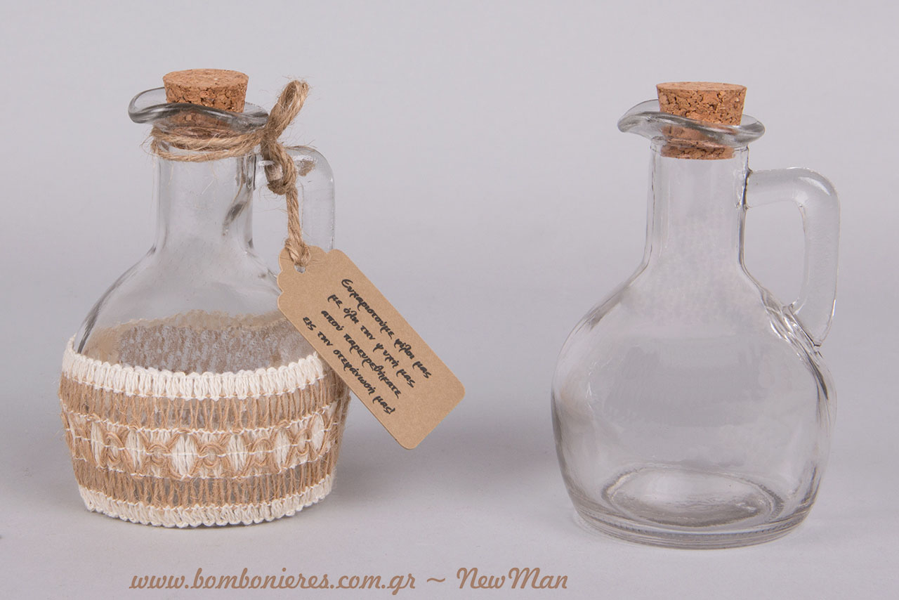 Ευχαριστείστε τους καλεσμένους σας για την παρουσία τους στην πιο σημαντική μέρα της ζωής σας, κερνώντας ρακή και στολίζοντας τα τραπέζια της δεξίωσης με αυτά τα πανέμορφα κανατάκια-ενθύμια, στολισμένα με κορδέλα από λινάτσα και με ευχαριστήρια μαντινάδα σε καρτούλα.