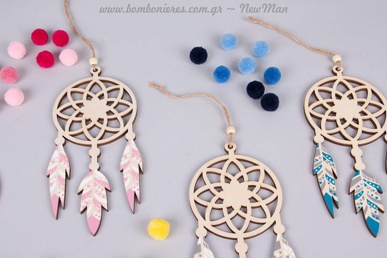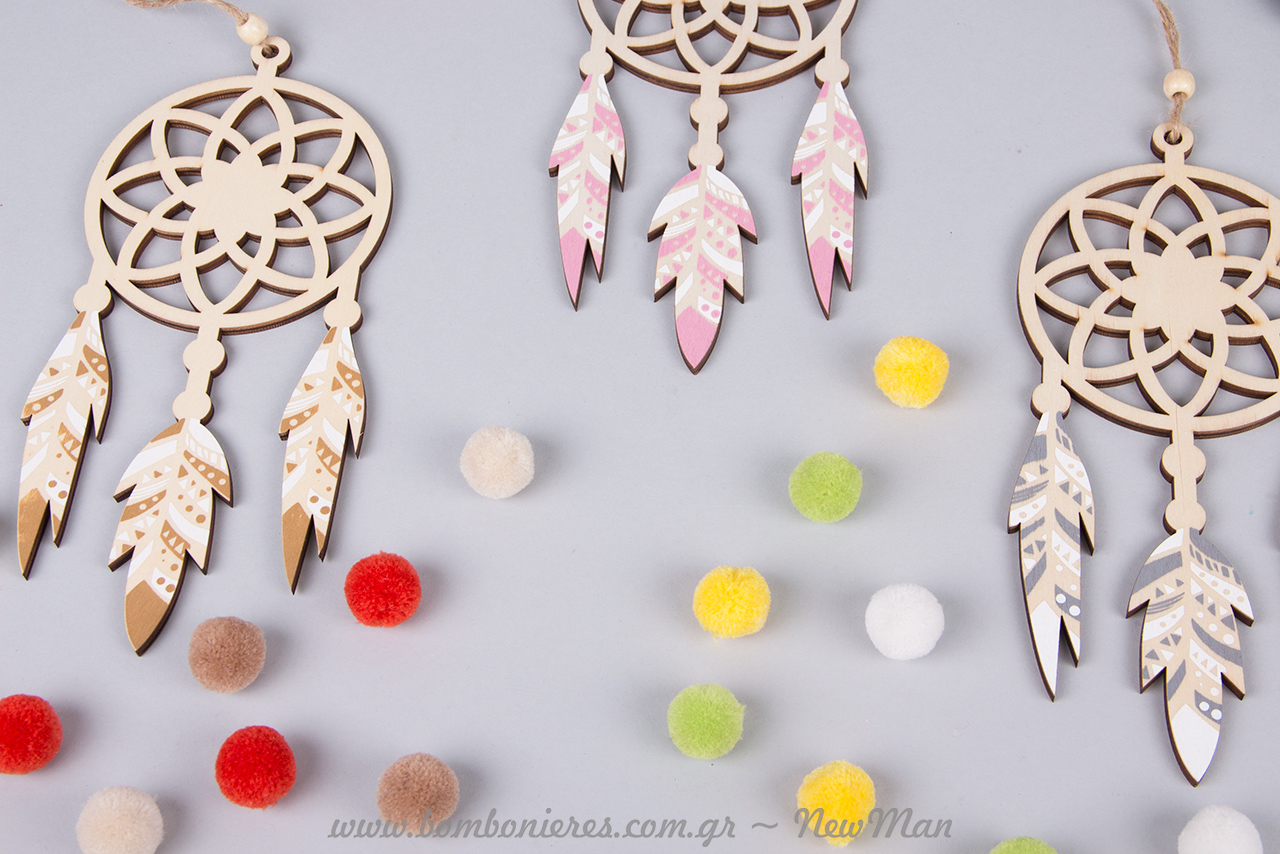Οι ξύλινες διακοσμητικές ονειροπαγίδες σε τέσσερις αποχρώσεις (ροζ, μπλε, γκρι, καφέ) είναι τόσο προσεγμένες στη λεπτομέρεια που πραγματικά νομίζεις ότι σκαλίστηκαν στο χέρι. Ιδανικές για να διακοσμήσουν την μπομπονιέρα του γάμου ή της βάπτισης (αγοριού & κοριτσιού), το βαπτιστικό κουτί ή το τραπέζι ευχών.
