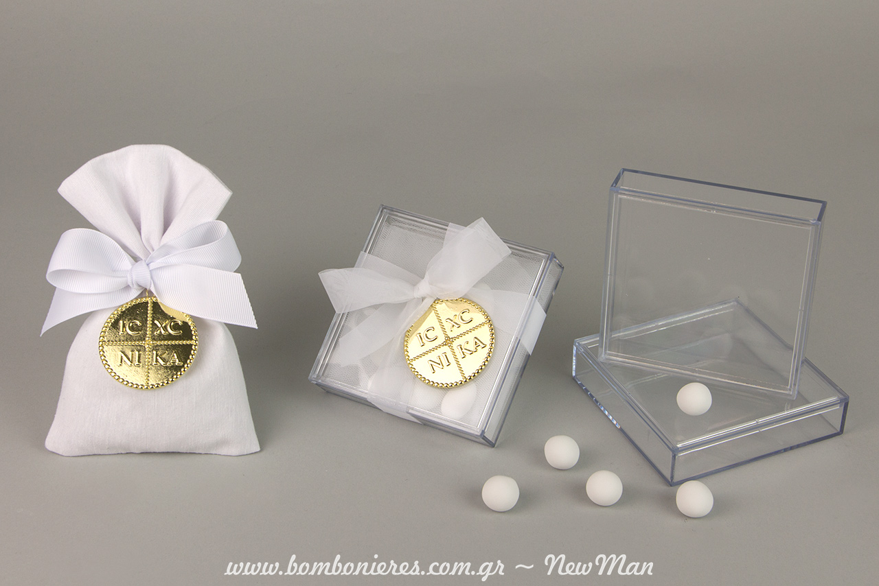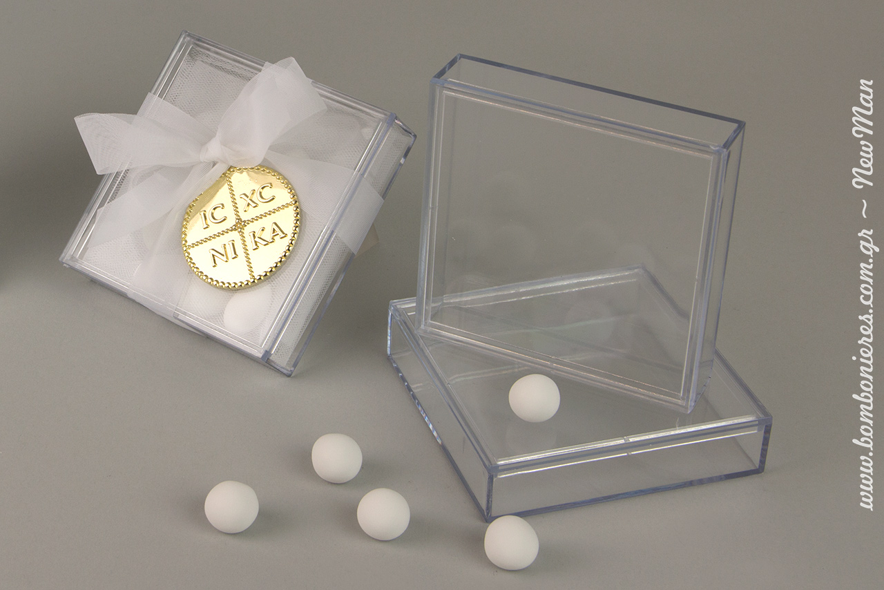 Για τη δημιουργία της θα χρειαστείτε τα εξής υλικά: μεταλλικό κωνσταντινάτο (ΙCXCNIKA) – διατίθεται σε συσκευασία των 5 τεμαχίων-, διάφανο κουτί (100 x 100 x 25mm), γαλλικό τούλι (39 x 39cm), υφασμάτινη κορδέλα βουάλ, ματ και κουφέτα Χατζηγιαννάκης Crispy λευκό ματ.