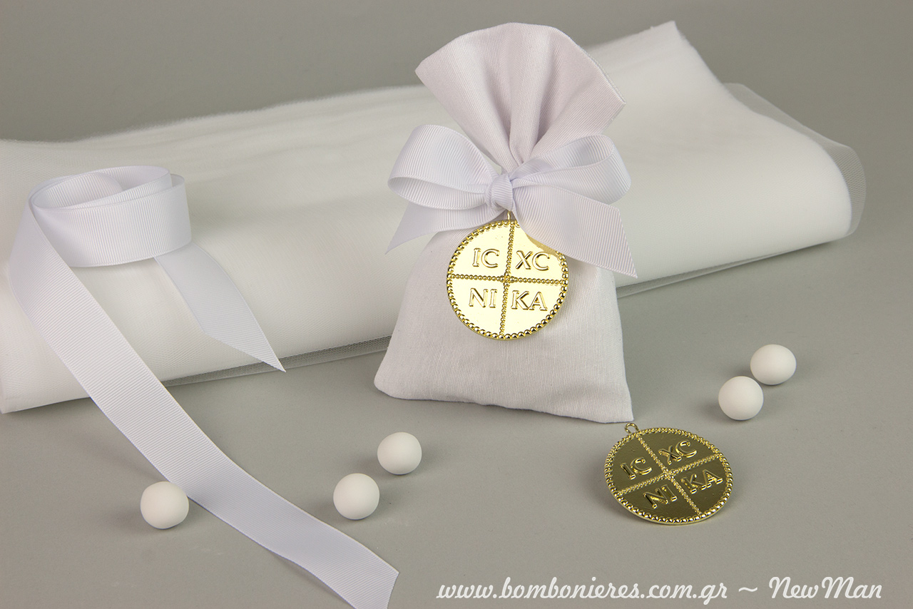 Για τη δημιουργία της θα χρειαστείτε τα εξής υλικά: μεταλλικό κωνσταντινάτο (ΙCXCNIKA) – διατίθεται σε συσκευασία των 5 τεμαχίων-, λευκό λινό πουγκί (11 x 17cm), λευκή κορδέλα γκρο, γαλλικό τούλι (39 x 39cm) και κουφέτα Χατζηγιαννάκης Crispy λευκό ματ.