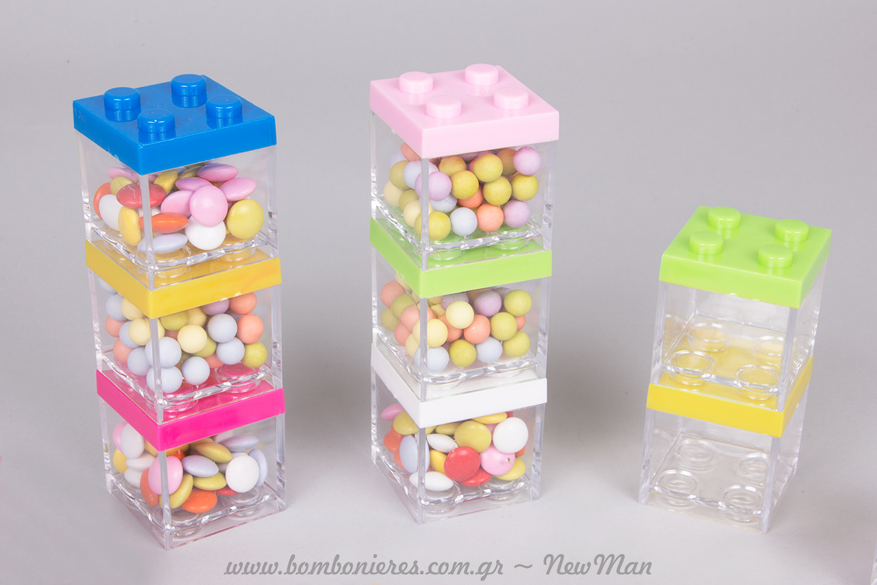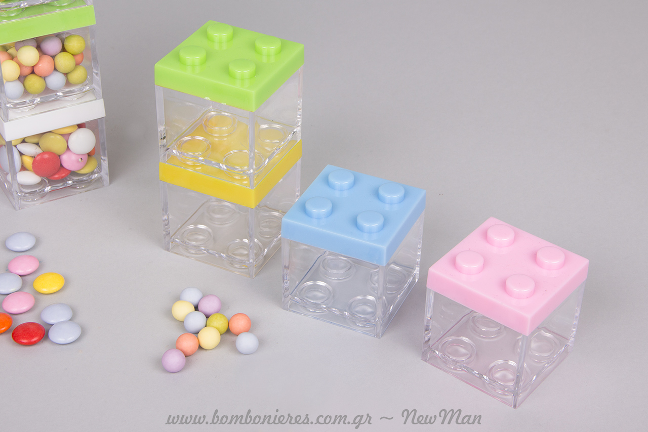 Οι διάφανοι μας κύβοι τύπου Lego, είναι μια πρωτότυπη και σούπερ παιχνιδιάρικη ιδέα για την μπομπονιέρα της βάπτισης και σίγουρα θα την χαρούν ιδιαίτερα οι μικροί σας καλεσμένοι.