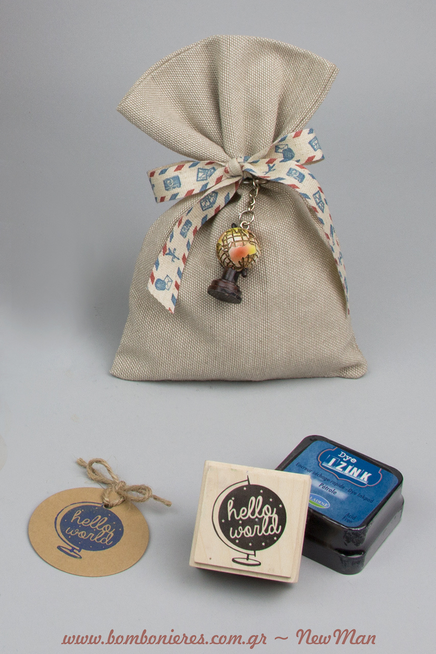 Μπομπονιέρα σε μπεζ υφασμάτινο πουγκί, συνδυασμένο με μίνι vintage μπρελόκ υδρόγειος και κορδέλα με σχέδιο γραμματόσημα.
