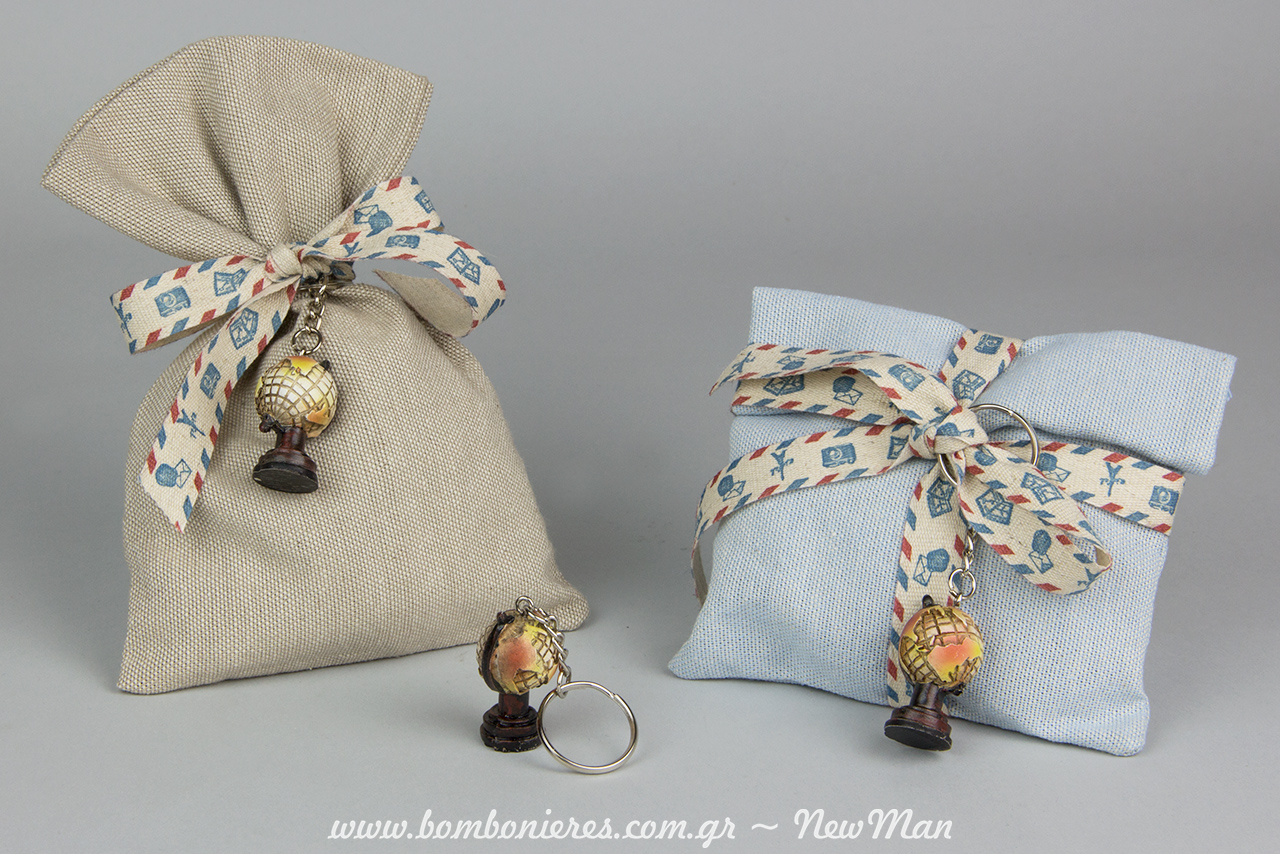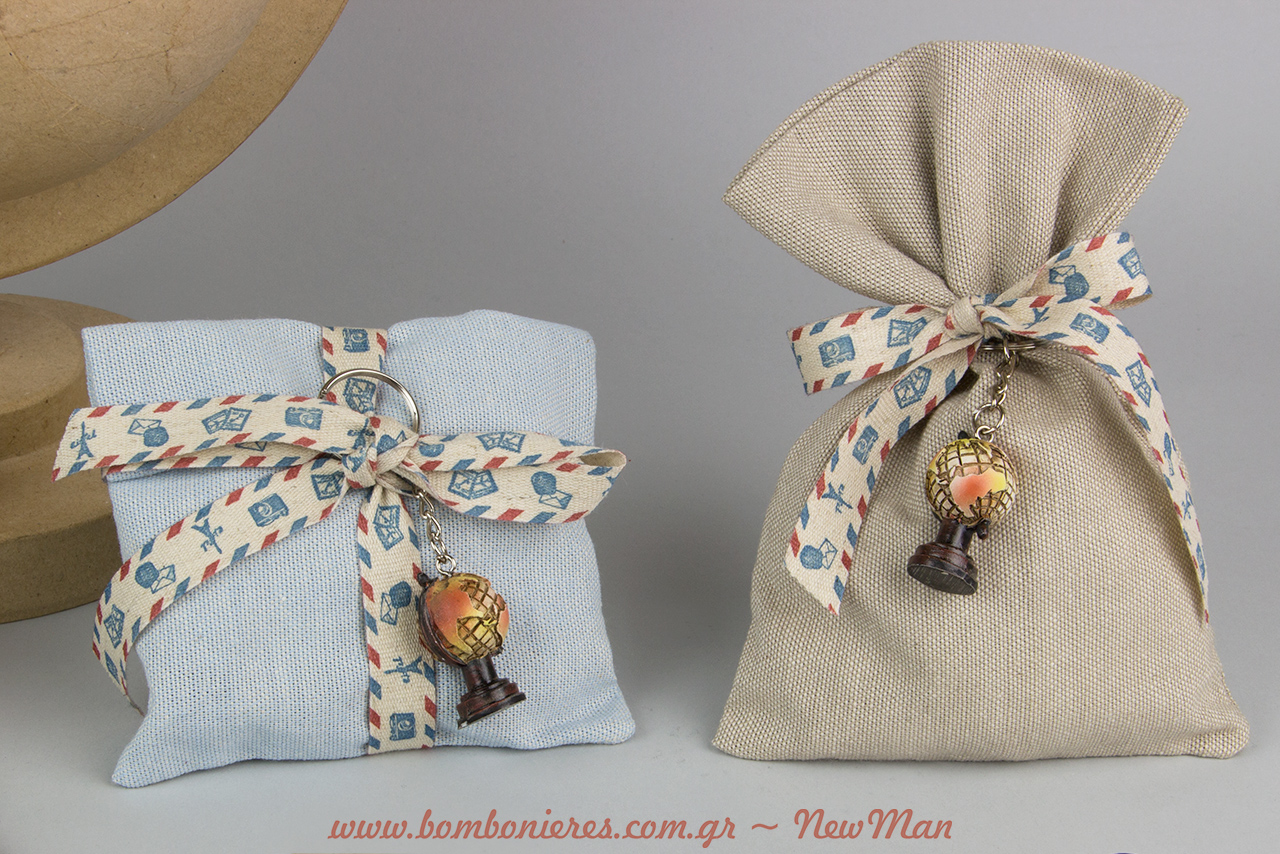 Ξεκινάμε με την μπομπονιέρα του μικρού ταξιδιώτη, τη βάση της οποίας αποτελούν τα υφασμάτινα πουγκιά σε μπεζ και σιέλ απόχρωση (13 x 18cm). Εμείς στο ύφος και την ατμόσφαιρα του θέματος, τα συνδυάσαμε με κορδέλα υφασμάτινη με σχέδιο γραμματόσημα και μπρελόκ με μικρή vintage υδρόγειο.