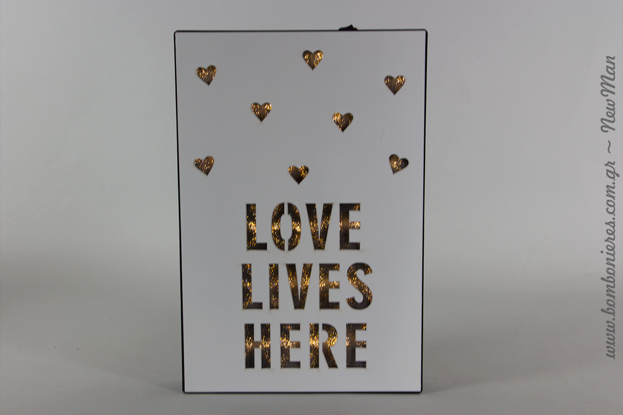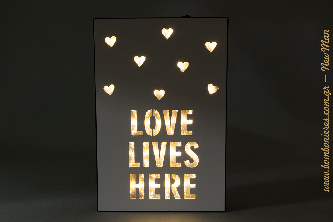Το ξύλινο κουτί «Love Lives Here» με φως LED σε διαστάσεις 20 x 3 x 30cm, είναι ιδανικό για να διακοσμήσετε το τραπέζι των ευχών, ενημερώνοντας παράλληλα με αυτό τον πρωτότυπο τρόπο τους καλεσμένους σας ότι ήρθε η ώρα για να γράψουν τις θερμότερες ευχές τους.