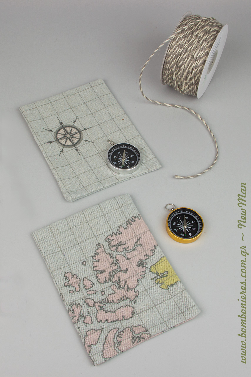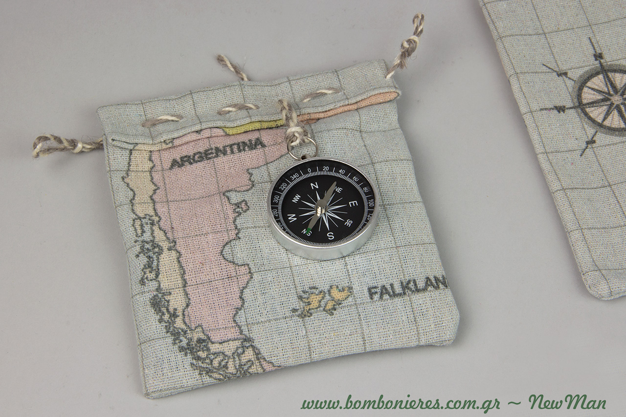 Μπομπονιέρα «Η μαγική πυξίδα» σε υφασμάτινο πουγκί με σχέδιο Yδρόγειος, για μια ξεχωριστή μπομπονιέρα που θα ταξιδέψει τους καλεσμένους σας στους πιο όμορφους καλοκαιρινούς συνειρμούς.