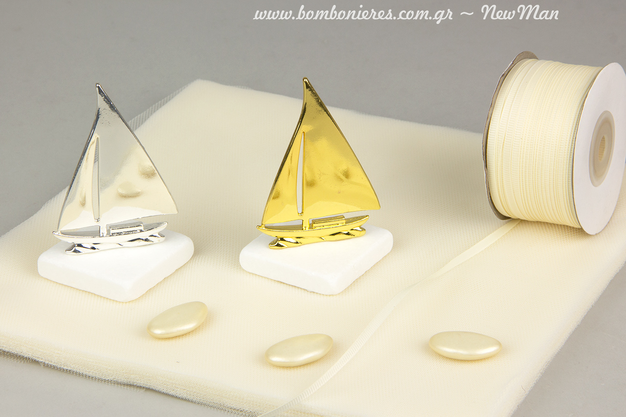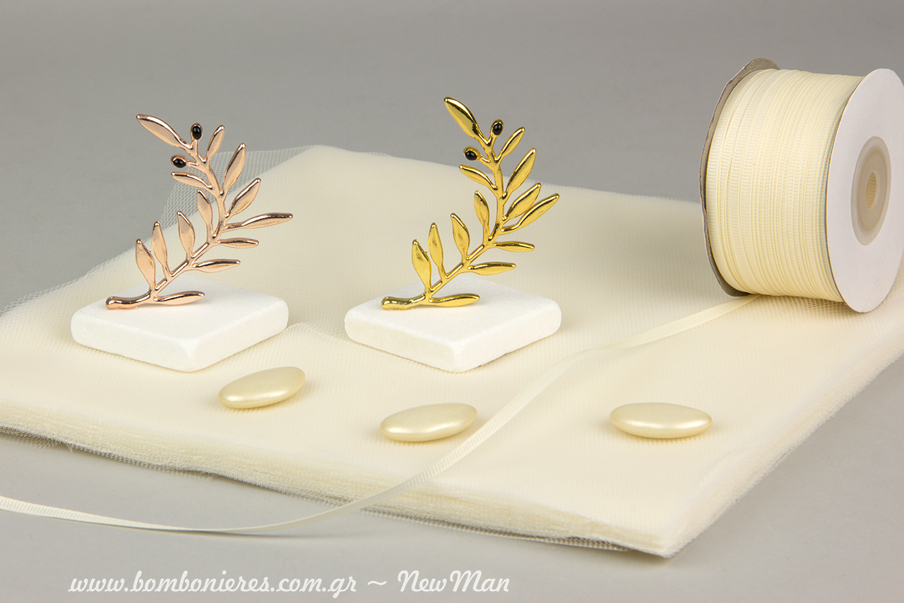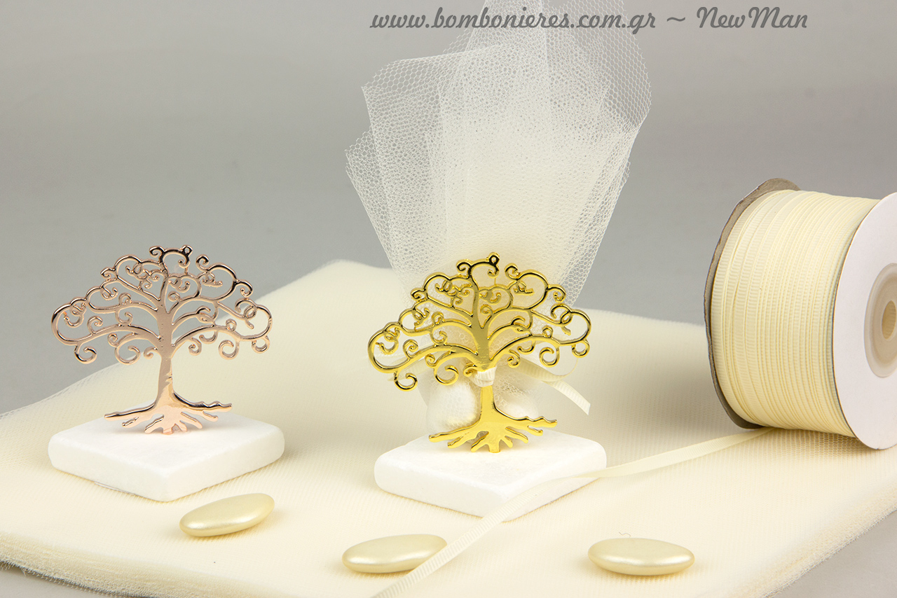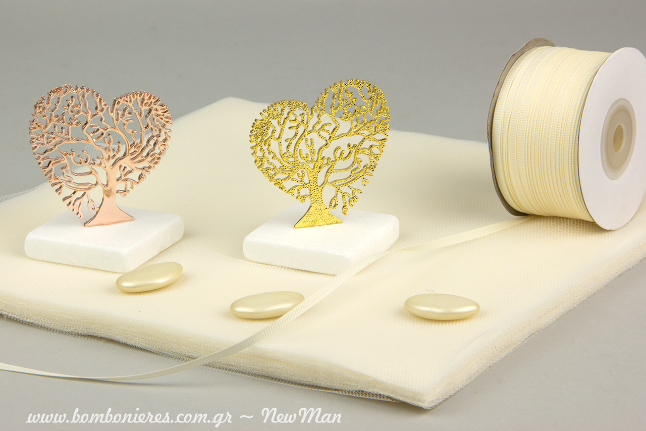 Όπως θα δείτε και στις φωτογραφίες οι μπομπονιέρες με μεταλλικά διακοσμητικά σε πέτρα διατίθενται σε τέσσερις διαφορετικές εκδοχές για να επιλέξετε σύμφωνα με τη θεματική και τους συμβολισμούς που ταιριάζουν καλύτερα σε εσάς ως ζευγάρι: α) μεταλλικό Δέντρο της Τύχης σε πέτρα (45 x 45 x 70mm) σε χρυσή ή ροζ χρυσή απόχρωση, β) μεταλλικό Καράβι σε πέτρα (45 x 45 x 90mm) σε χρυσή ή ασημί απόχρωση, γ) μεταλλική Καρδιά σε πέτρα (45 x 45 x 70mm) σε χρυσή ή ροζ χρυσή απόχρωση και δ) μεταλλικό Κλαδί Ελιάς σε πέτρα (45 x 45 x 70mm) επίσης σε χρυσή ή ροζ χρυσή απόχρωση.
