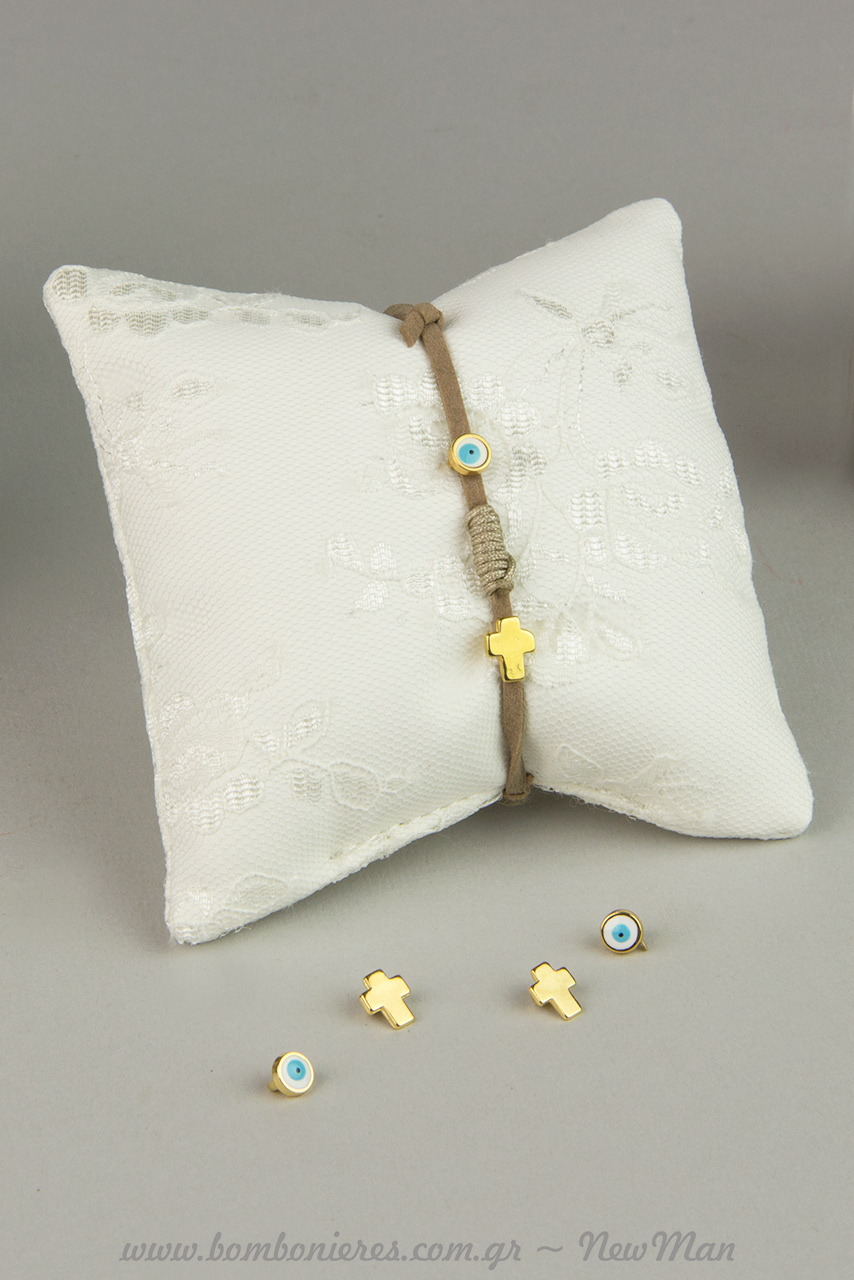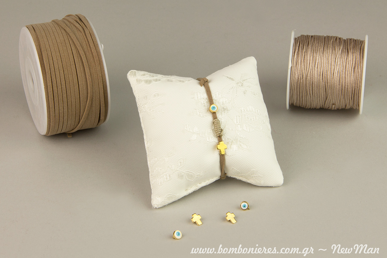 Φτιάξτε τα μαρτυρικά βραχιολάκια μόνοι σας επιλέγοντας υλικά της επιλογής σας από το κατάστημα Newman. Για τη σημερινή μας DIY πρόταση θα χρειαστείτε: κορδόνι δερματάκι (φ. 3mm), καστόνι στρογγυλό ματάκι (SS16 3 x 2mm), μίνι σταυρός σε χρυσή απόχρωση (2.5 x 1.5mm) και κορδόνι πολυεστέρα.
