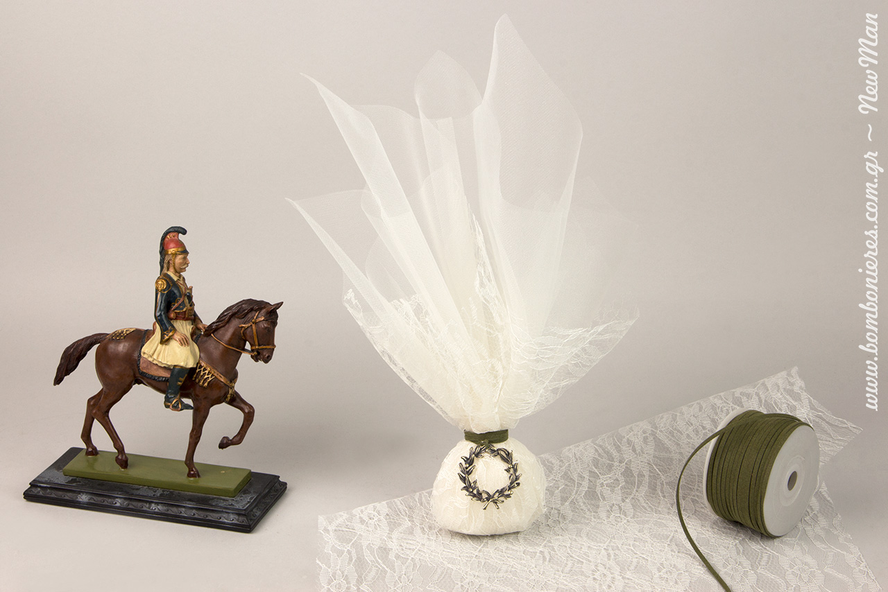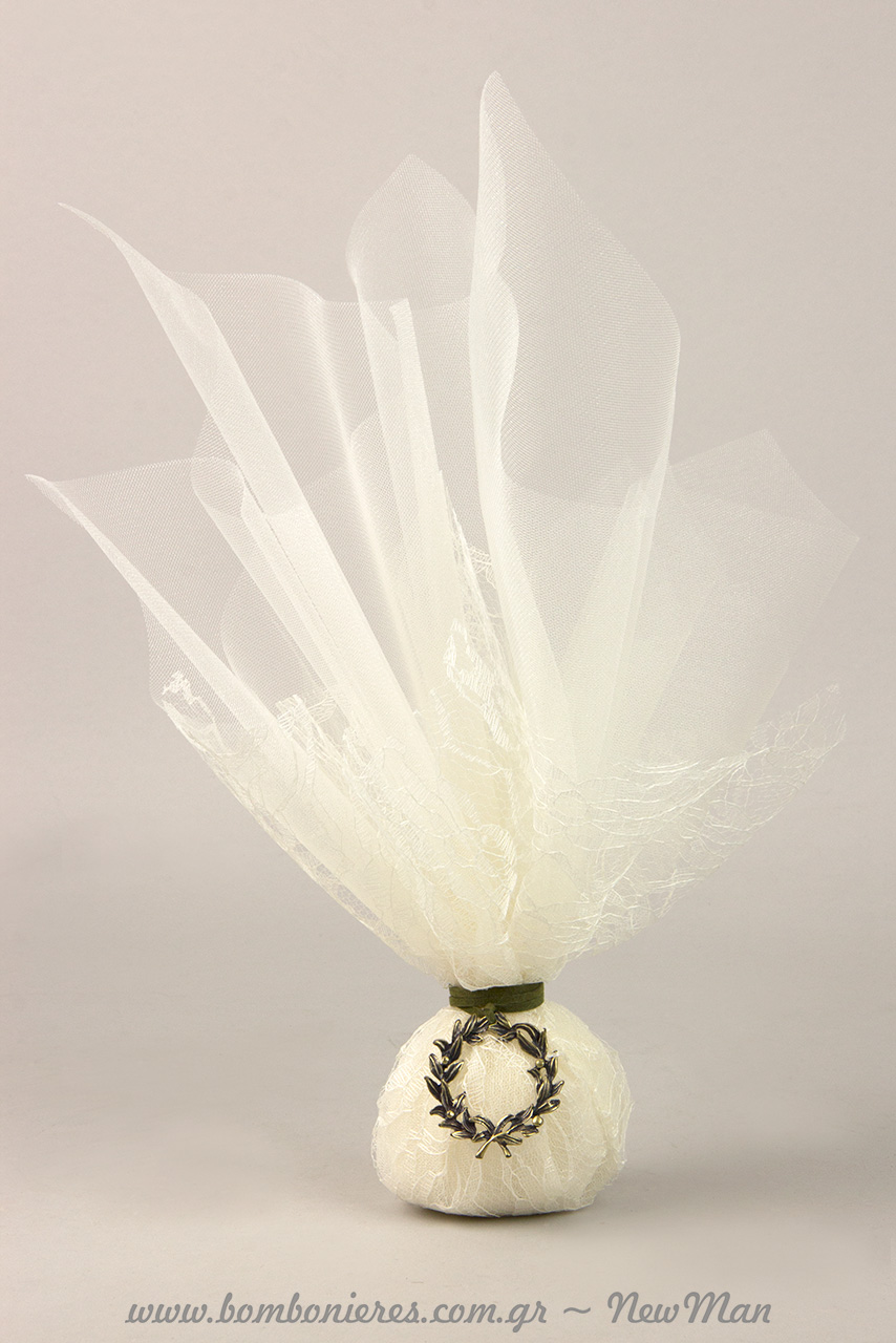 Για τη δημιουργία της θα χρειαστείτε τα εξής υλικά: πετσετάκι δαντέλα (36 x 36cm), τούλι γαλλικό κρυσταλιζέ σε ανοιχτά χρώματα, ελληνικό τούλι επίσης σε ανοιχτά χρώματα, κορδόνι δερματάκι, μπρούτζινο στεφανάκι (43 x 43mm) και κουφέτα Χατζηγιαννάκης Together Stracciatella.