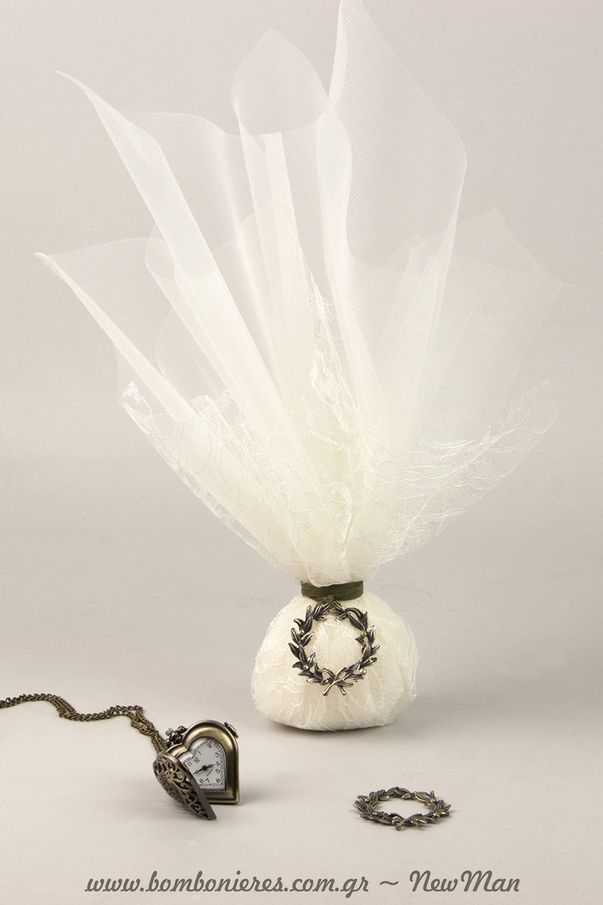 Με έμπνευση την παλιά Αθήνα, λοιπόν, η Λίλιαν Νιούμαν, δημιούργησε την ξεχωριστή αυτή τούλινη μπομπονιέρα με μπρούτζινο στεφανάκι, της οποίας η ρομαντική κομψότητα είμαστε σίγουροι θα κλέψει τις εντυπώσεις.