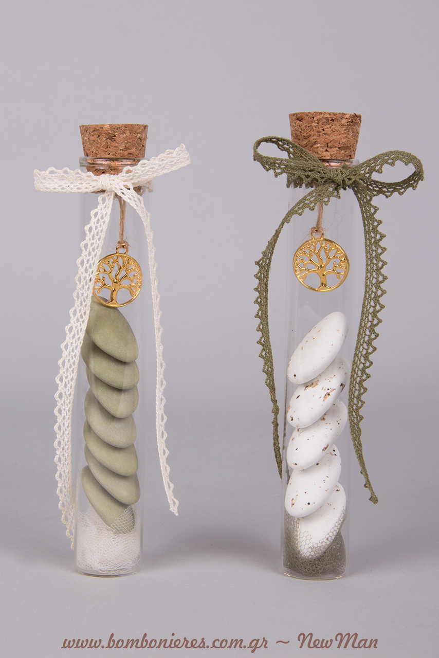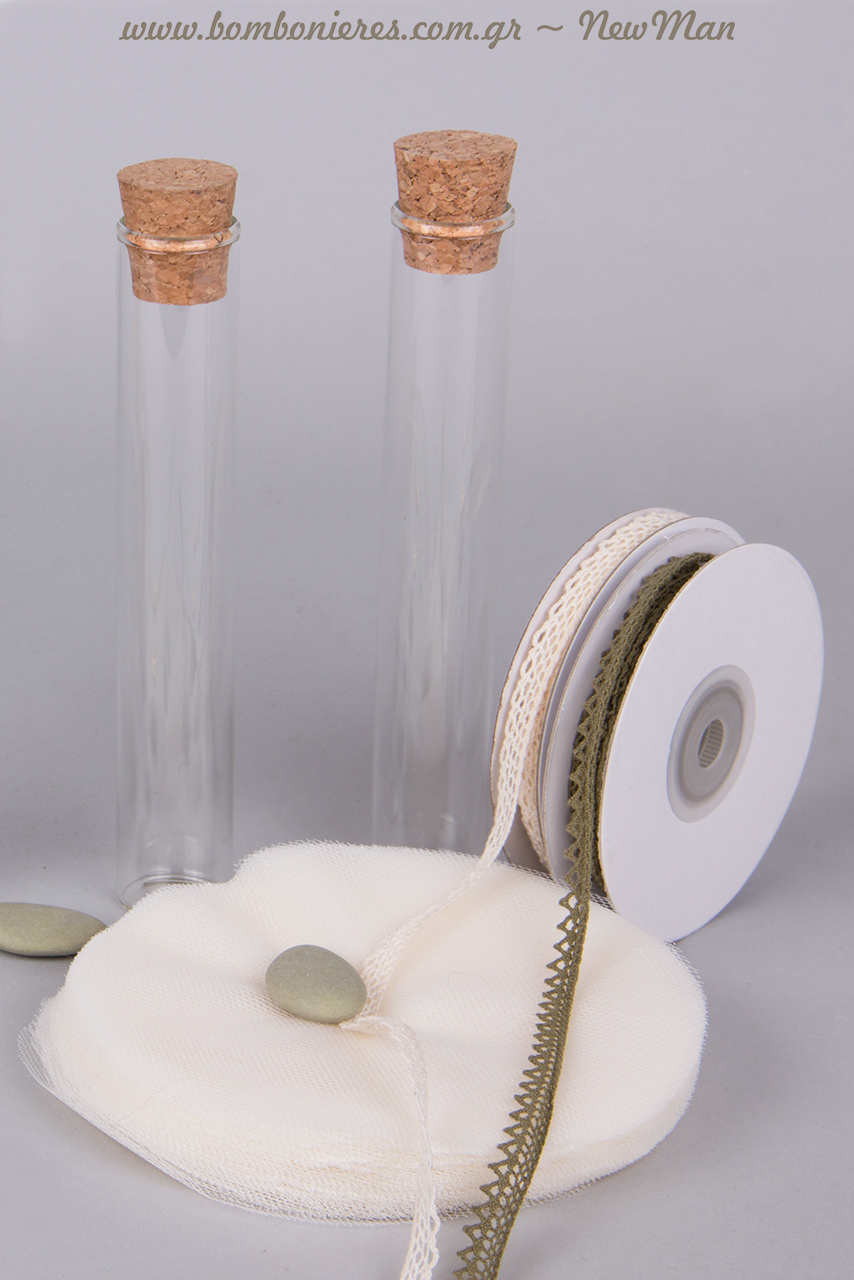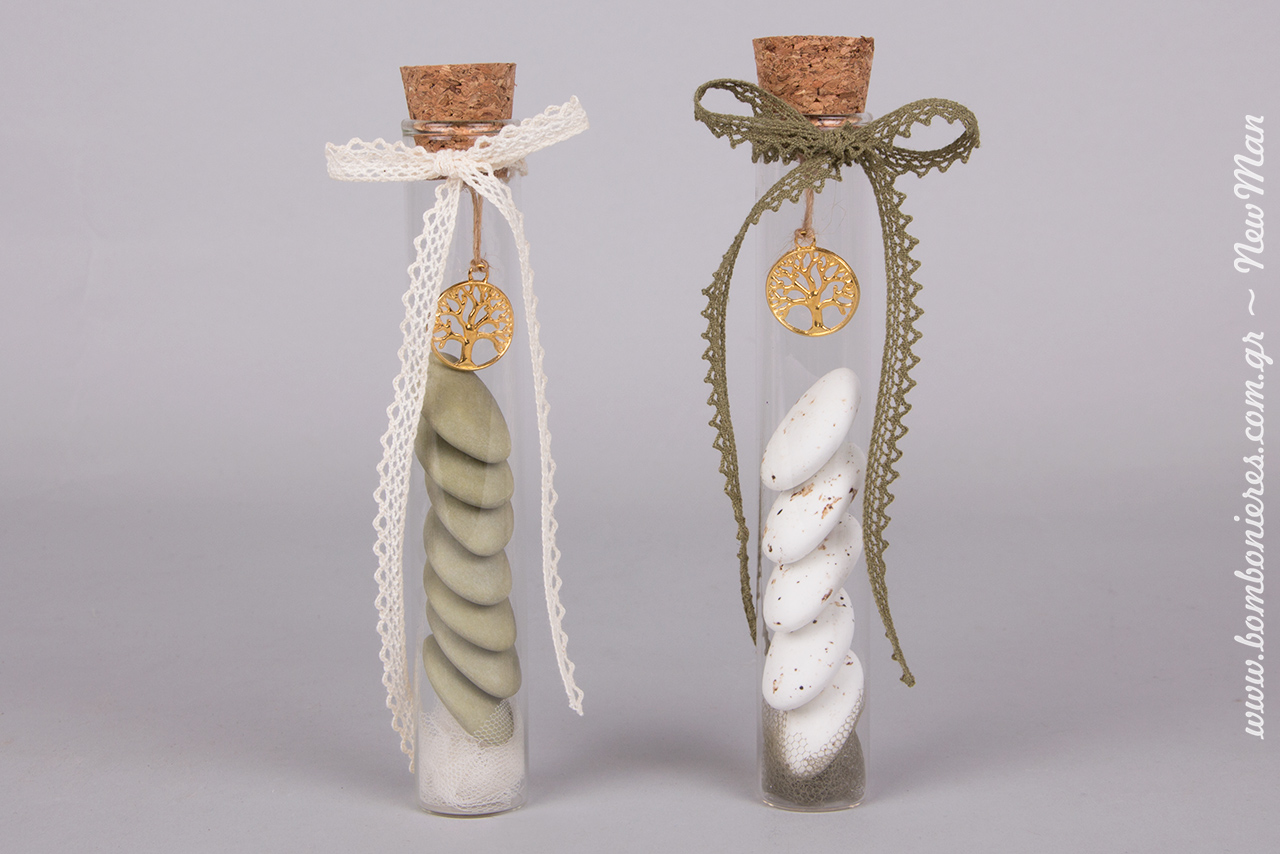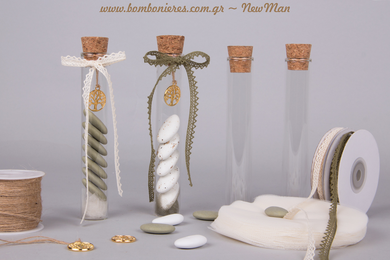 Για τη δημιουργία της θα χρειαστείτε διακοσμητικό μεταλλικό Δέντρο της Ζωής (2cm), γυάλινο σωλήνα με φελλό (25x150mm), δαντελοκορδέλα σε πράσινο χακί και λευκό χρώμα, σπάγκο (λινάτσα), τούλι ελληνικό και κουφέτα σοκολάτας Χατζηγιαννάκης (Bijoux Supreme) και τα δυο σε διπλές αποχρώσεις του πράσινου και του λευκού.