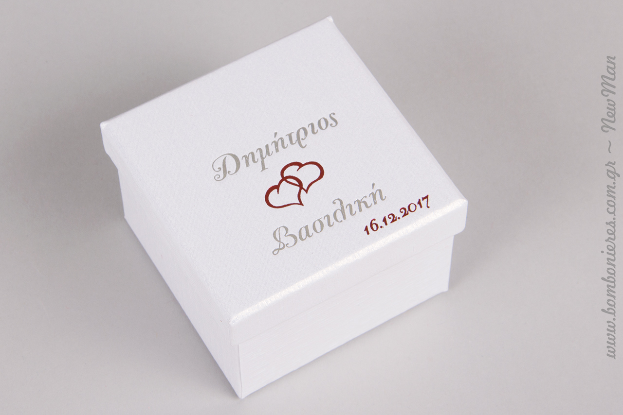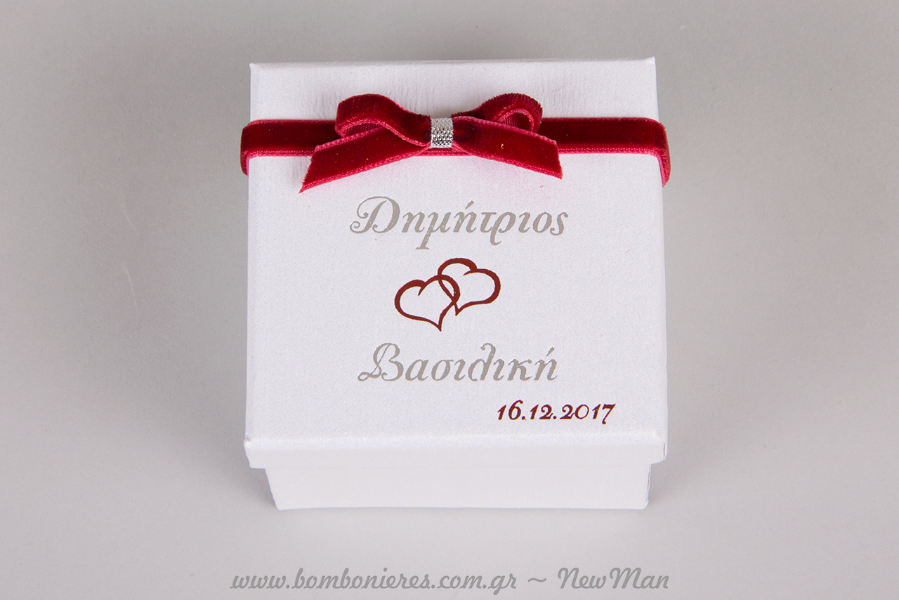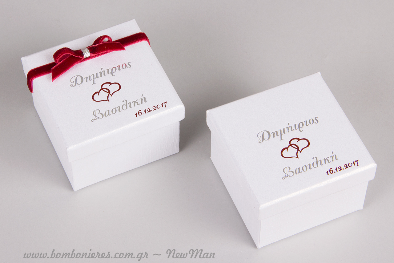 Μπομπονιέρα σε λευκό ή εκρού κουτί (7 x 7 x 5cm), με τυπωμένα (θερμοτυπία) τα ονόματα του ζευγαριού και την ημερομηνία του γάμου τους.