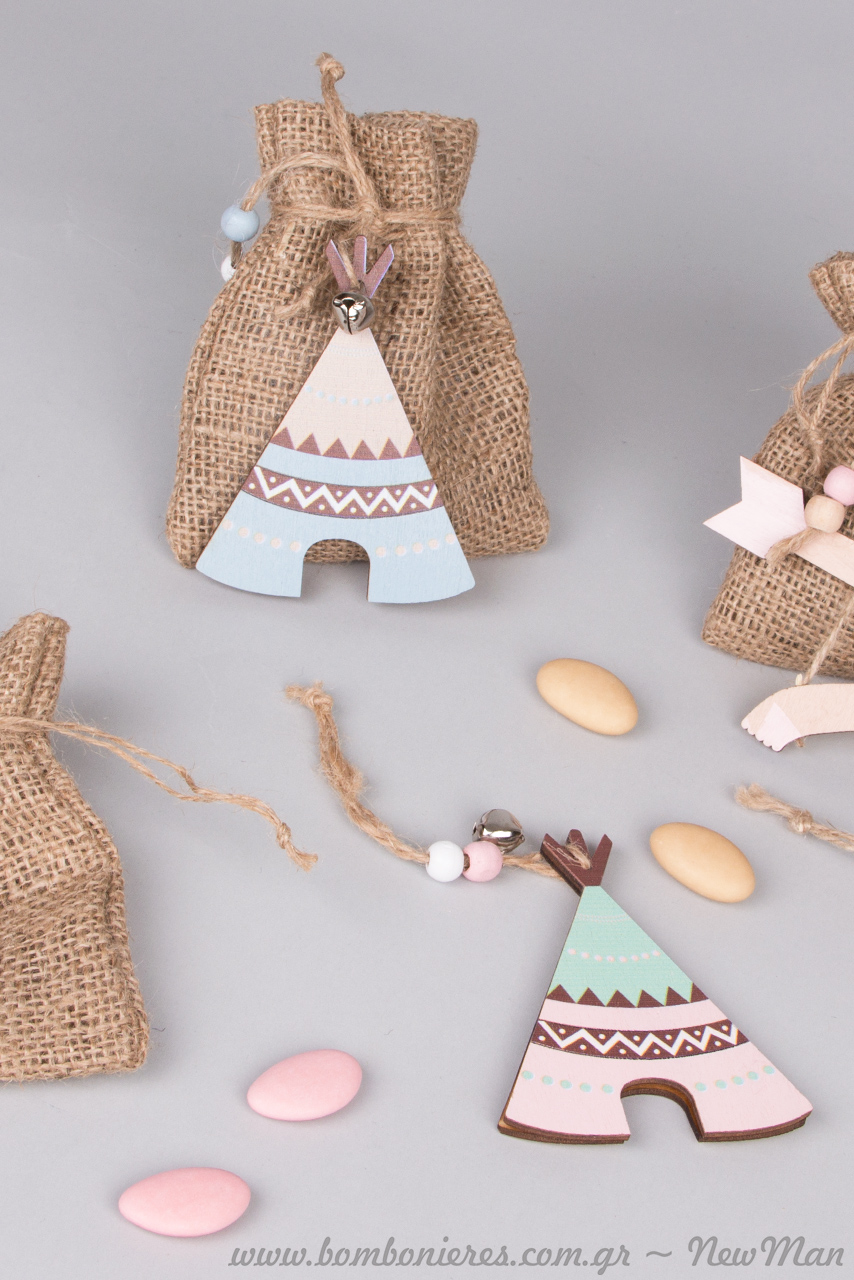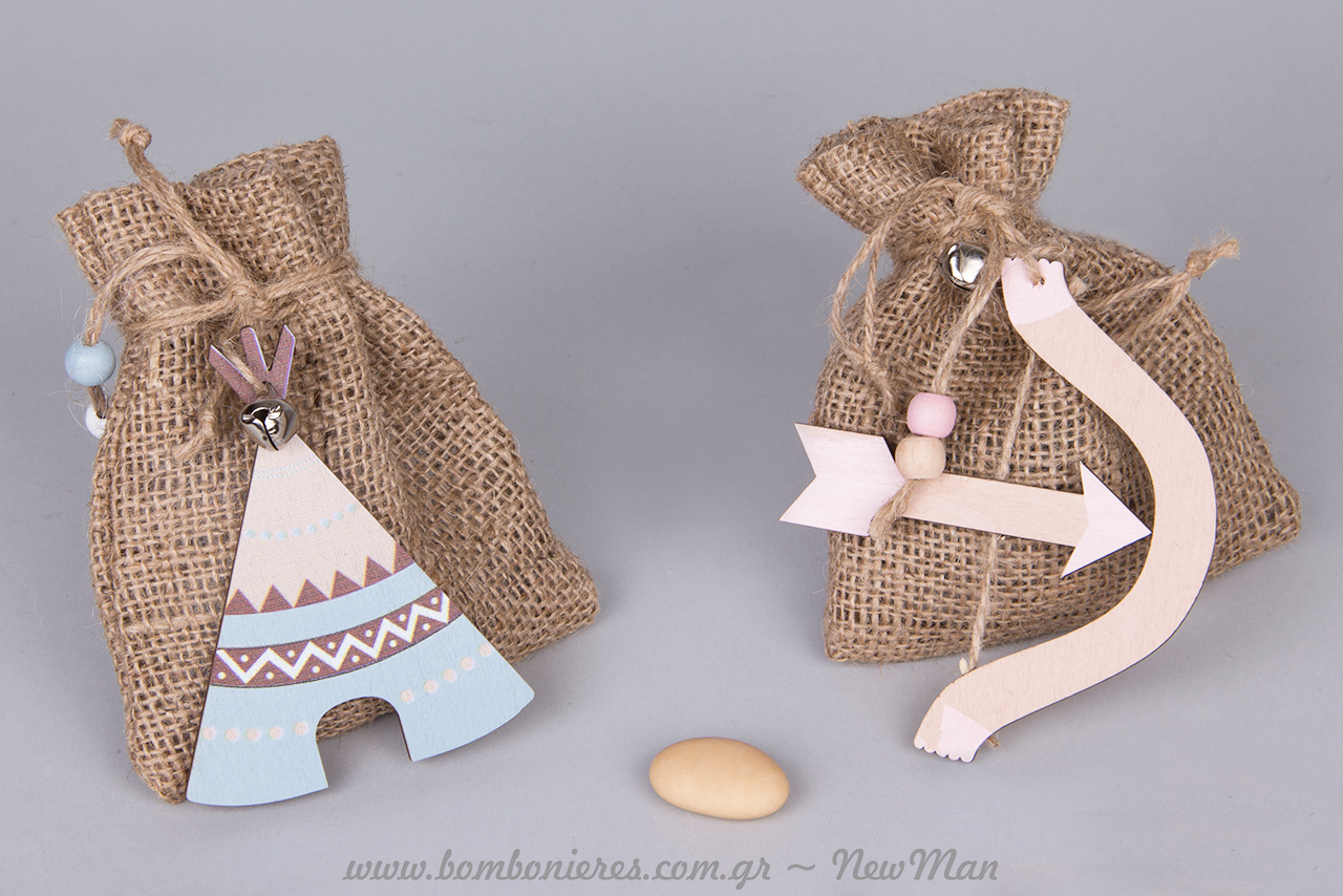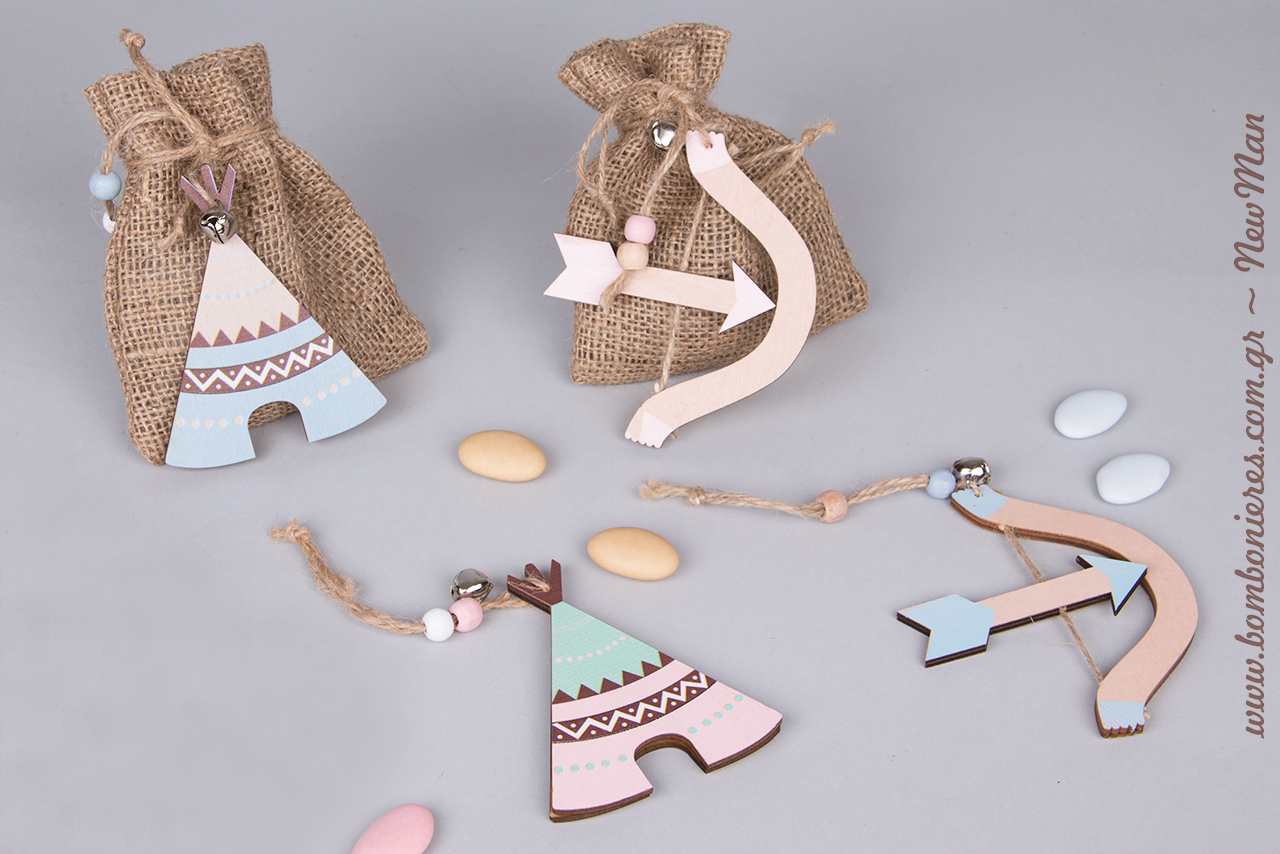 Μπομπονιέρα σε πουγκί από λινάτσα Ιndia (φυσικό), διακοσμημένη με ξύλινη κρεμαστή ινδιάνικη σκηνή (ροζ ή σιέλ) & κρεμαστό ξύλινο τόξο επίσης σε ροζ ή σιέλ αποχρώσεις, αναλόγως το φύλο του μωρού.