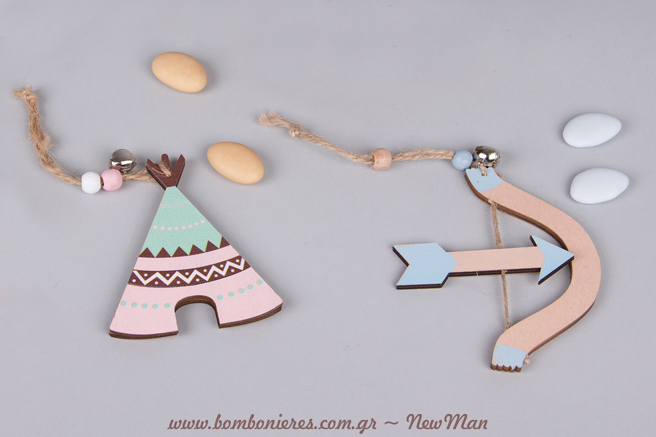 Ξύλινη κρεμαστή ινδιάνικη σκηνή σε ροζ ή σιέλ – αναλόγως το φύλο του μωρού- για την μπομπονιέρα της βάπτισης. Μπομπονιέρα: «Μικρός Ινδιάνος» & «Μικρή Ινδιάνα» για τη βάπτιση του μικρού ή της μικρής σας.