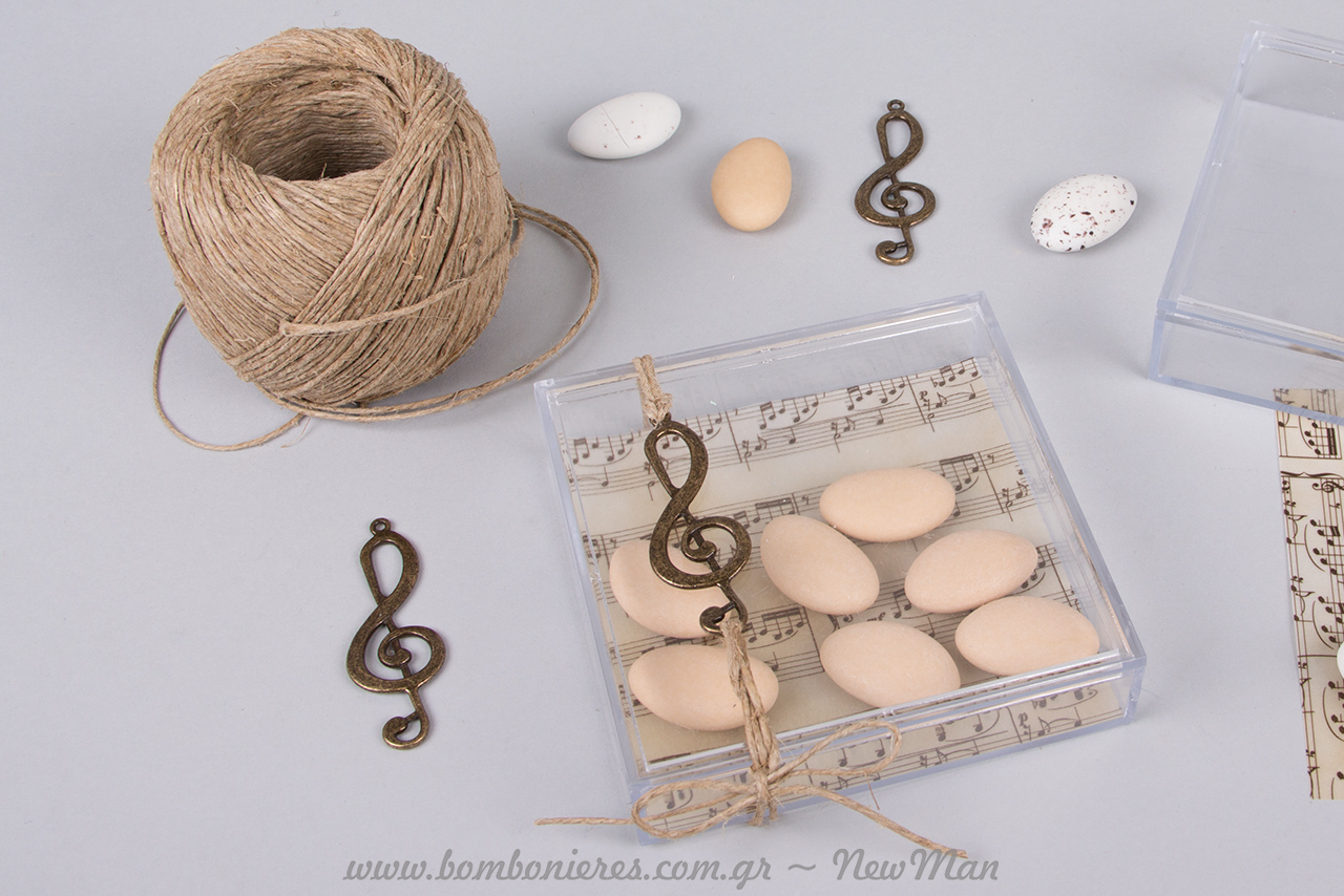 Η ξεχωριστή αυτή μπομπονιέρα μας αποτελείται από το τετράγωνο κουτί (πλεξιγκλάς), το οποίο επενδύσαμε εσωτερικά με χαρτί παρτιτούρα (Heyda paper) και κουφέτα Χατζηγιαννάκης σε διάφορες γεύσεις κι αποχρώσεις. Στο εξωτερικό του, για να ολοκληρώσουμε το μουσικό μας θέμα, “δέσαμε” το κουτί μας με σπάγκο στο οποίο στερεώσαμε το κλειδί του Σολ.