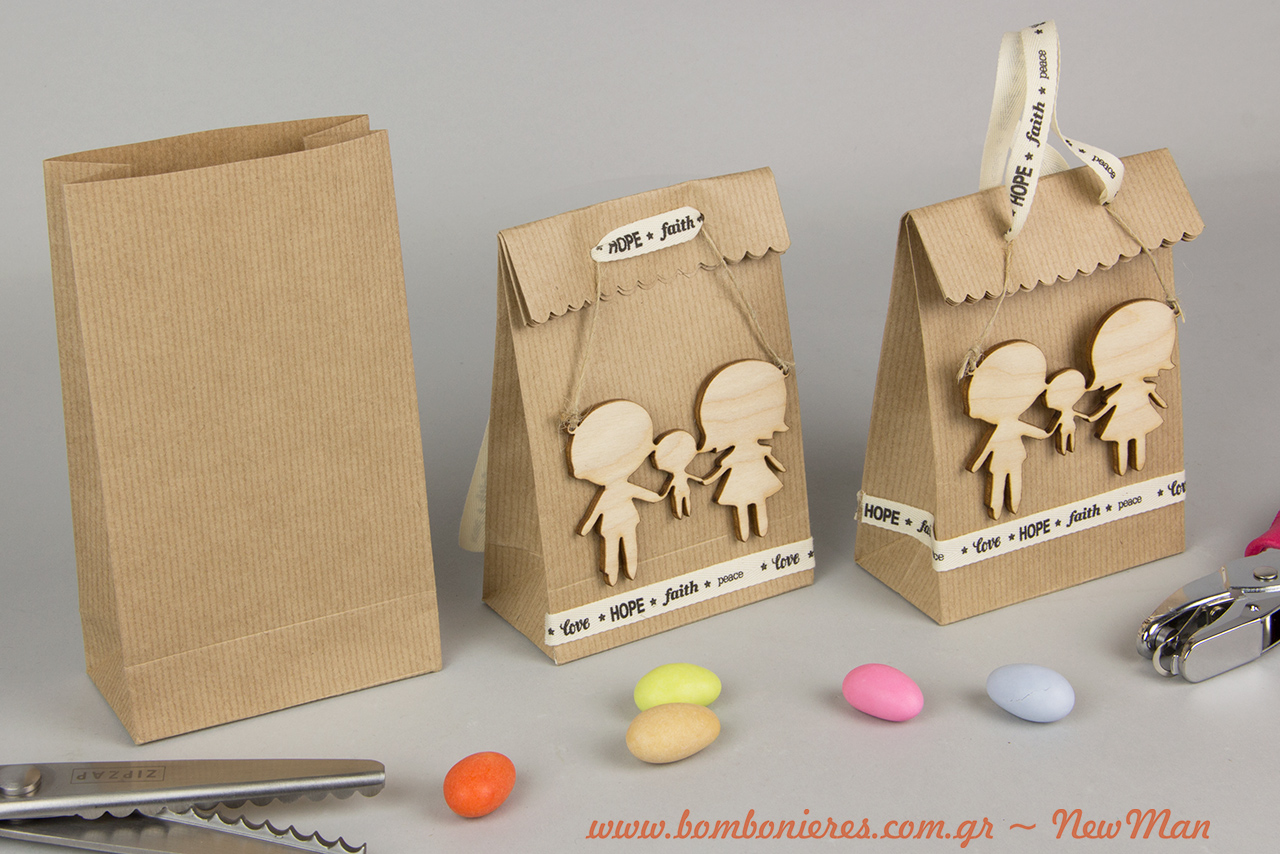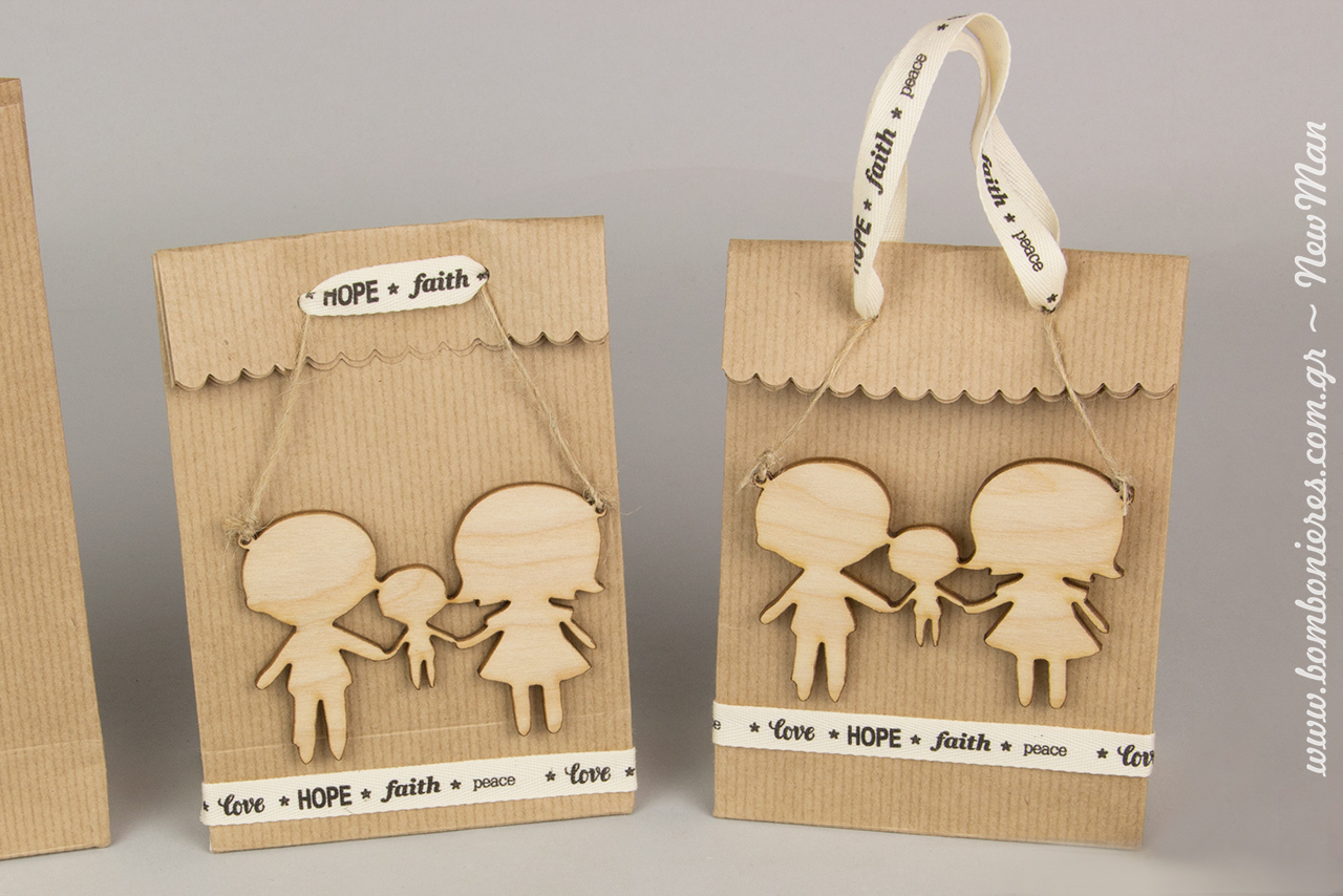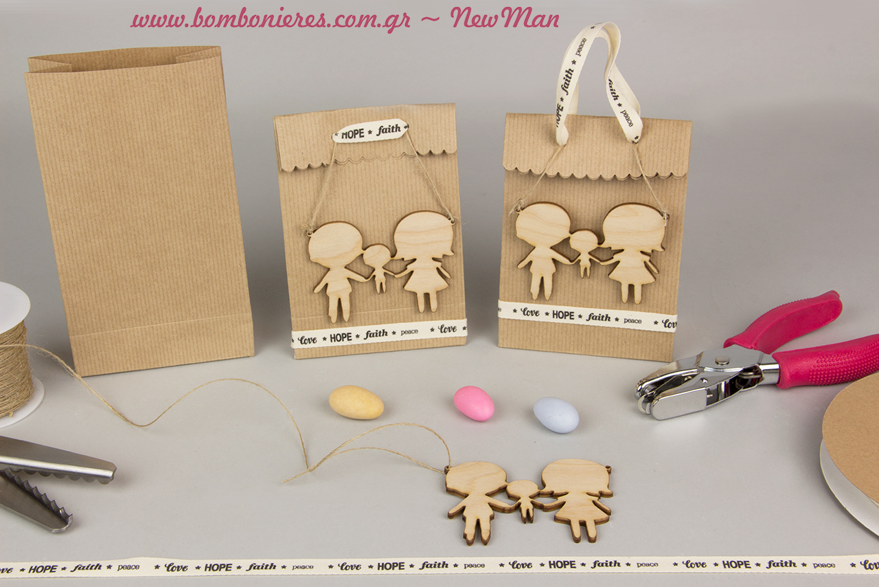Για τη δημιουργία της θα χρειαστείτε τα εξής υλικά: τσάντα φάκελο kraft No 1 (95 x 165 x 50mm), ξύλινο διακοσμητικό «οικογένεια» με μαμά-μπαμπά-μωρό (8cm), σπάγκο λινάτσα, κορδέλα βαμβακερή με ευχές (Love/Hope/Faith/Peace), ψαλίδι Zik Zak οβάλ 20cm Solingen, εργαλείο Πέρφο Pince κύκλος (3mm), τούλι ελληνικό και κουφέτα Χατζηγιαννάκης Choco Almond Πολύχρωμο.