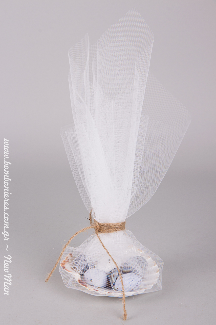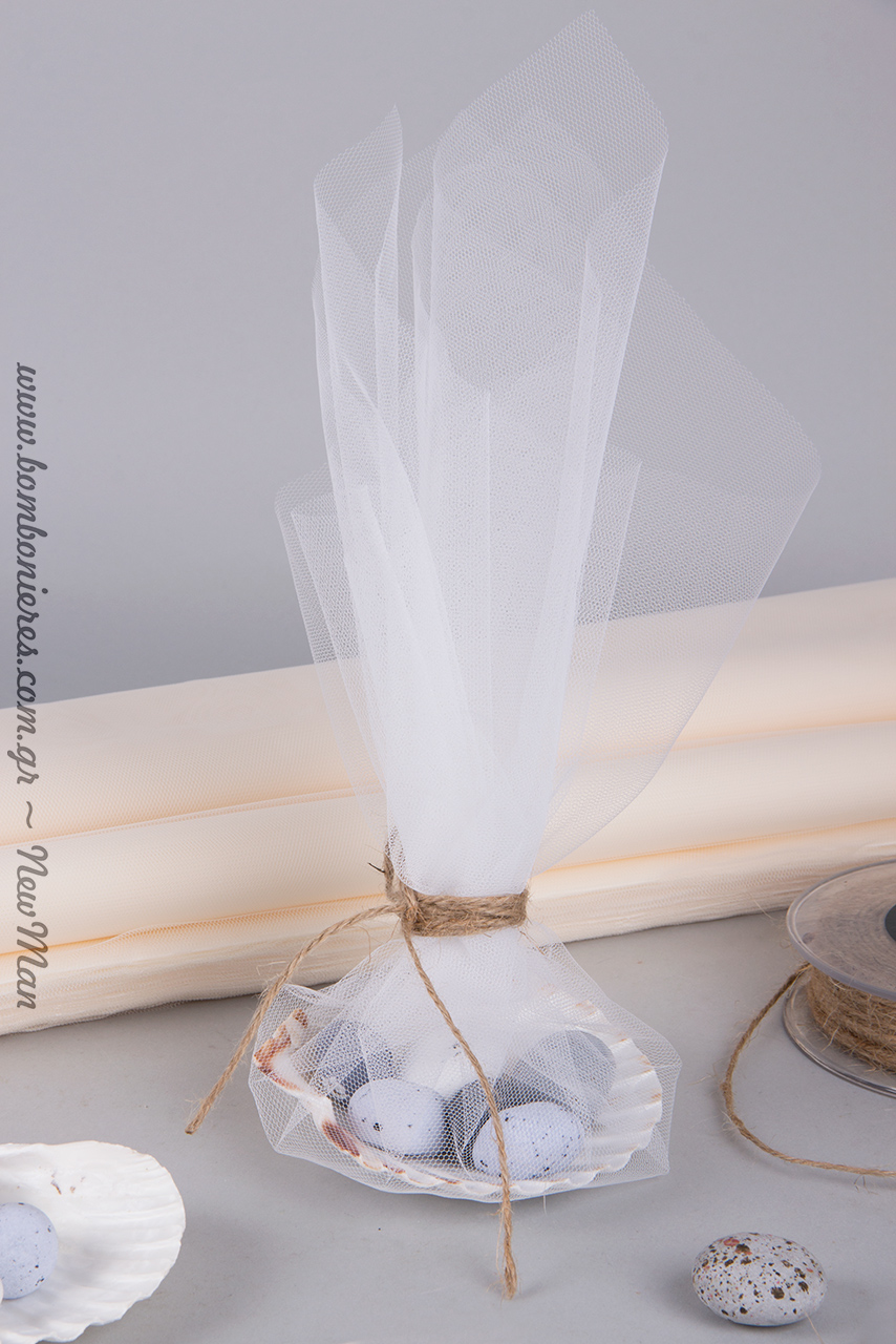 Τοποθετήστε τα χτένια στο κέντρο της τούλινης επιφάνειας (μονό φύλλο), γεμίστε το με πεντανόστιμα κουφέτα-βότσαλα κι ολοκληρώστε δένοντας την μπομπονιέρα με κορδόνι γιούτα ψιλό σε φυσική απόχρωση.