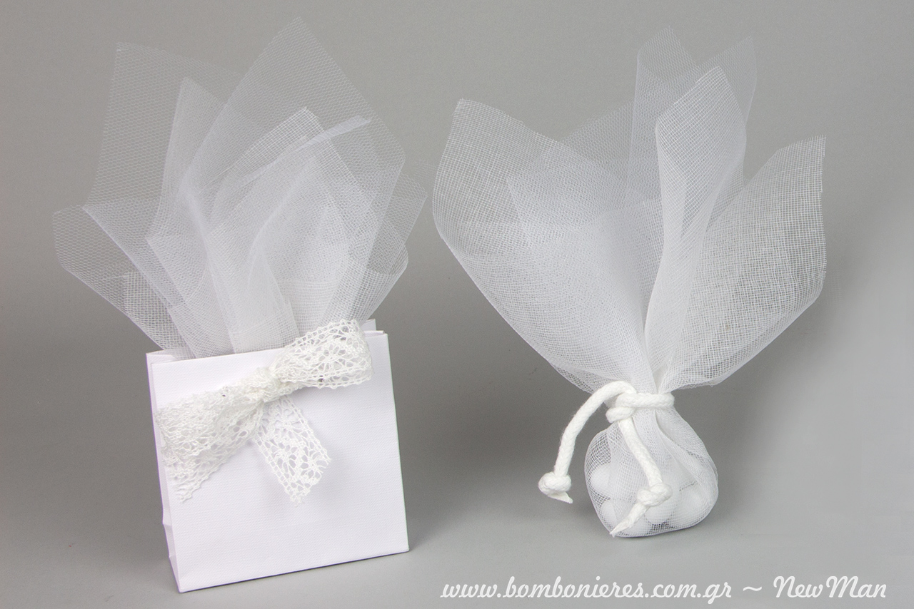 Ενώ τα βήματα για να τη φτιάξουμε έχουν ως εξής: α) αφαιρούμε από τις τσάντες Gofrato το βαμβακερό λευκό κορδόνι, το οποίο κρατάμε στην άκρη, β) φτιάχνουμε τις τούλινες μπομπονιέρες συνδυάζοντας την υφασμάτινη γάζα με τούλι ελληνικό (και τα δυο σε λευκό), τις οποίες κατόπιν κλείνουμε με τα βαμβακερά κορδονάκια που φυλάξαμε στην άκρη, γ) βάζουμε τις τούλινες μπομπονιέρες μέσα στις τσάντες Gofrato και δ) εκεί που ήταν το κορδόνι περνάμε την κορδέλα δαντέλα με την οποία στο τέλος κλείνουμε το τσαντάκι.