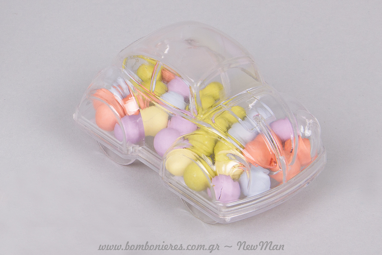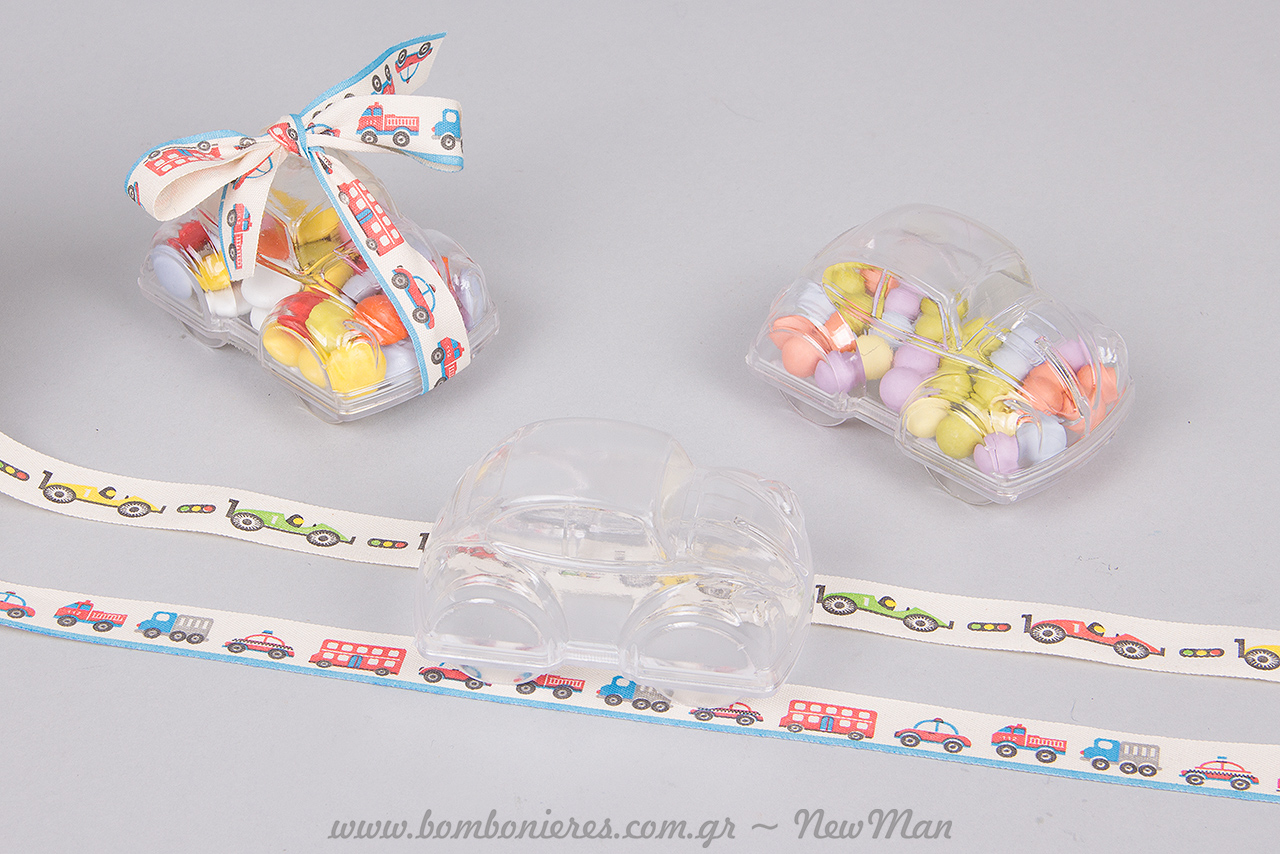 Ο διάφανος σκαραβαίος-κουτί, είναι μια πολύ οικονομική και πρωτότυπη ιδέα για αγορίστικη μπομπονιέρα. Το θέμα «αυτοκίνητο» θα σας δώσει και πολλές ιδέες για τον υπόλοιπο στολισμό. Συνδυάστε το με κορδέλες βαμβακερές- αυτοκόλλητη ή απλή- με θέμα επίσης αυτοκινητάκια και δώστε έξτρα χρώμα γεμίζοντας τον Σκαραβαίο μας με πεντανόστιμα, πολύχρωμα κουφέτα. (Rondo Bebe ή σοκολατένια).