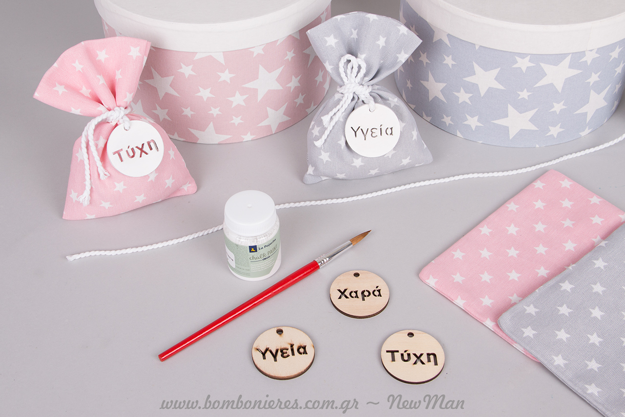 H μπομπονιέρα Little star είναι κατάλληλη τόσο για αγορίστικη όσο και για κοριτσίστικη βάπτιση και αποτελείται από τα άριστης ποιότητας λινά πουγκάκια μας με αστέρια σε ροζ ή γκρι χρώμα (19x 13 εκ.), διακοσμημένα με ξύλινες ευχές (Τύχη-Χαρά-Υγεία) και βαμβακερό κορδόνι. Κάντε το extra mile και χρωματίστε τις ξύλινες ευχές με Chalk Paint 75ml Blanc Nuages. Στο κατάστημά μας, Θησέως 10, θα βρείτε όλα τα υλικά που θα χρειαστείτε καθώς και πινέλο ακουαρέλας.