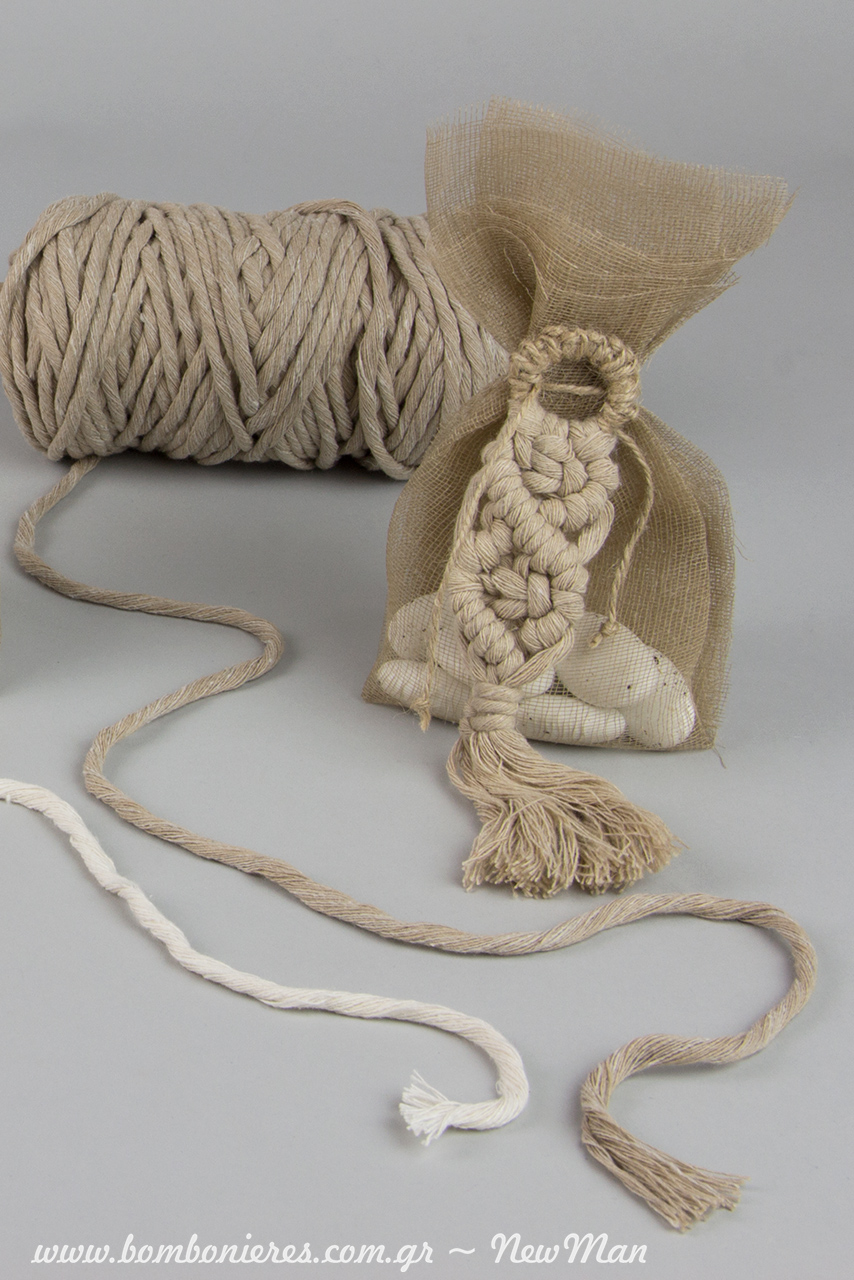 Μπομπονιέρα με διακοσμητικό μακραμέ σε φυσική απόχρωση. Για τη δημιουργία του διακοσμητικού θα χρειαστείτε κορδόνι μακραμέ σε φυσική απόχρωση και κρίκους: (κρίκος μπρελόκ μικρός/2.5cm και κρίκος μπρελόκ χρυσός με βερνίκι/ 2.5cm).