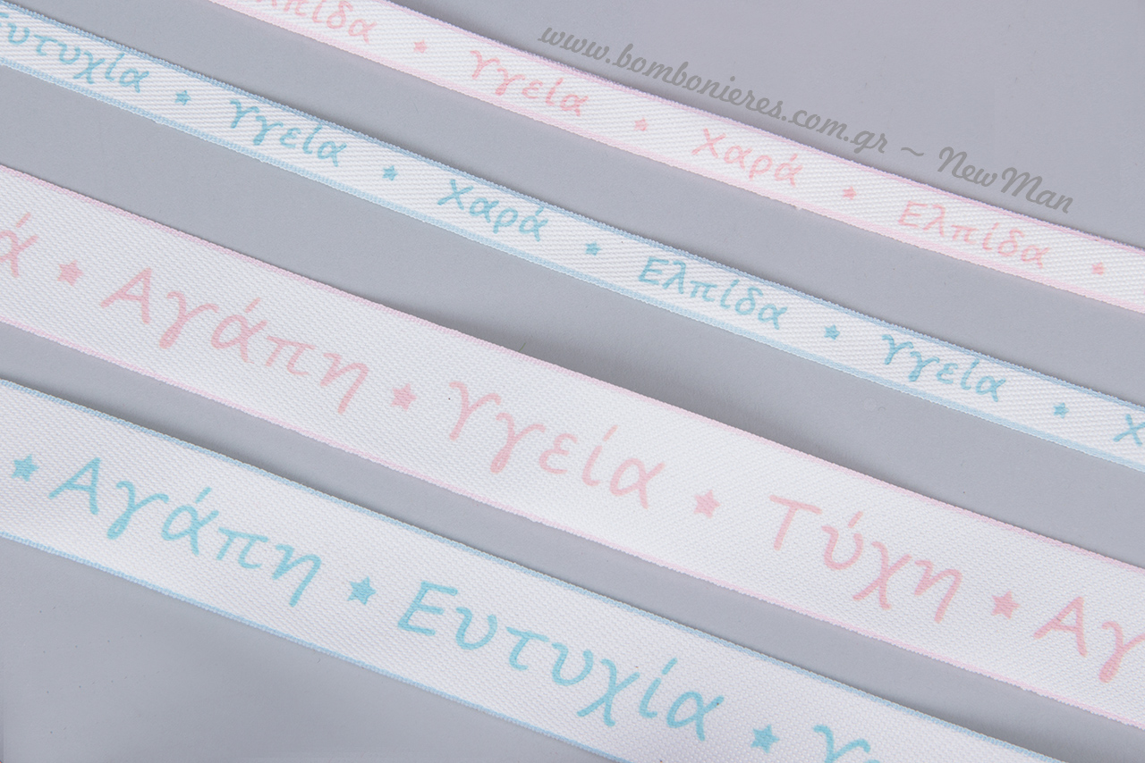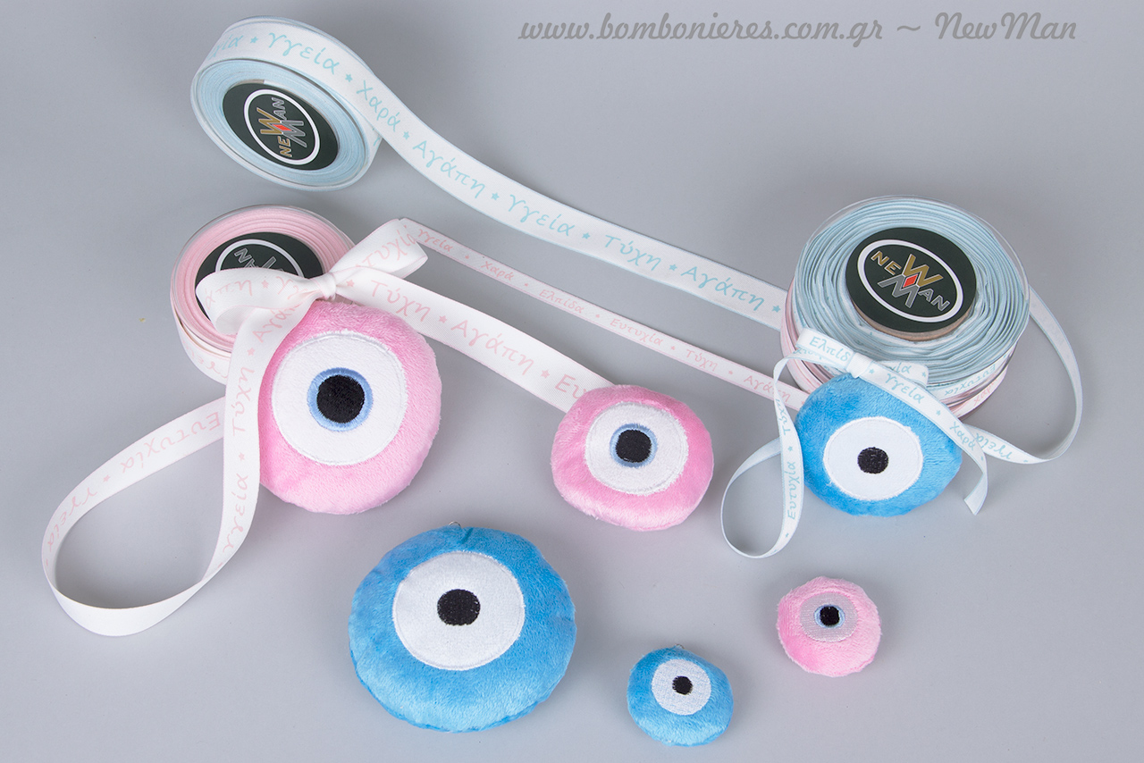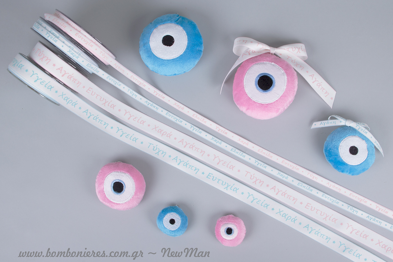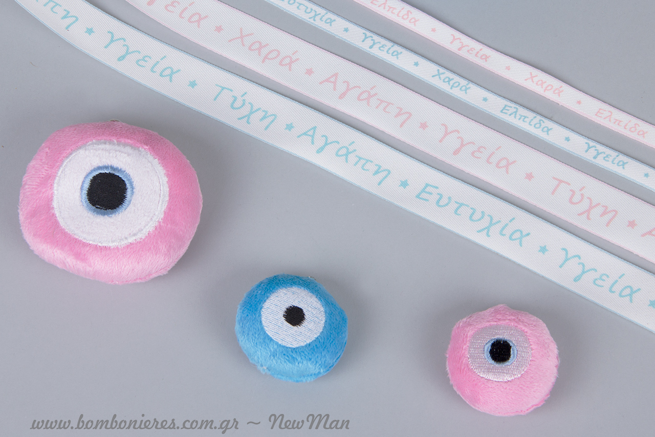 Αν βαπτίζετε κοριτσάκι διαλέξτε το ροζ μαξιλαράκι με σχέδιο μάτι στις διαστάσεις που επιθυμείτε και συνδυάστε το με ροζ Unique κορδέλα με ευχές (Τύχη, αγάπη, ευτυχία, υγεία). Αντίστοιχα η κορδέλα με τις γαλάζιες ευχές για αγοράκι. Η κορδέλα Unique διατίθεται επίσης σε δυο διαφορετικές διαστάσεις (10mm x 18m) και (25mm x 9m).
