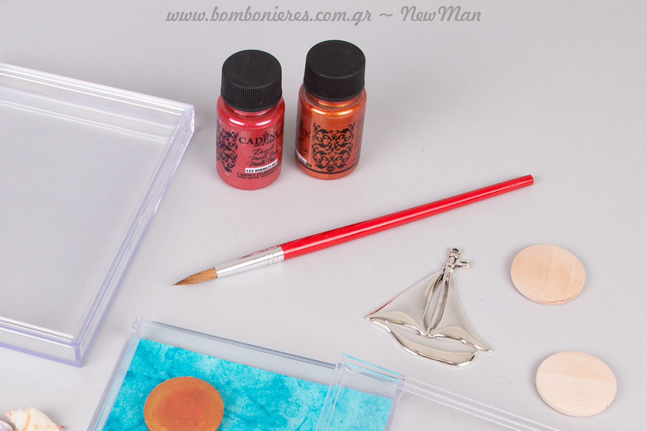 Το κουτί που εμπνεύστηκε η Λίλιαν Νιούμαν, αιχμαλωτίζει μέσα του ένα κομμάτι θάλασσας και μαζί όλους τους συμβολισμούς της. Διαλέξτε ένα όμορφο χαρτί όπως αυτό που βλέπετε στην φωτογραφία σε γαλαζοπράσινες αποχρώσεις και κολλήστε το στην εσωτερική πλευρά του κουτιού ή αν προτιμάτε ζωγραφίστε την στην απόχρωση που επιθυμείτε. Στη συνέχεια γεμίζετε το κομψό κουτί από πλεξιγκλάς με κοχυλάκια- διατίθενται σε συσκευασία του κιλού- γυάλινους σωλήνες σε διάφορα μεγέθη, κουφέτα που μοιάζουν με μεγάλα βότσαλα και φυσικά το μεταλλικό καραβάκι μας (σε ασημί αντικέ απόχρωση). Ο ήλιος (ξύλινη χάντρα πλακέ) ζωγραφίστηκε με μεταλλικό χρώμα (Dora metallic paint 50ml Dadence).