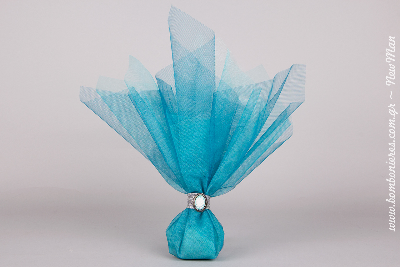 Τούλινη μπομπονιέρα σε μπλε αποχρώσεις με δέσιμο δαχτυλίδι και διακοσμητικό κρεμαστό cameo με σχέδιο τριαντάφυλλο.