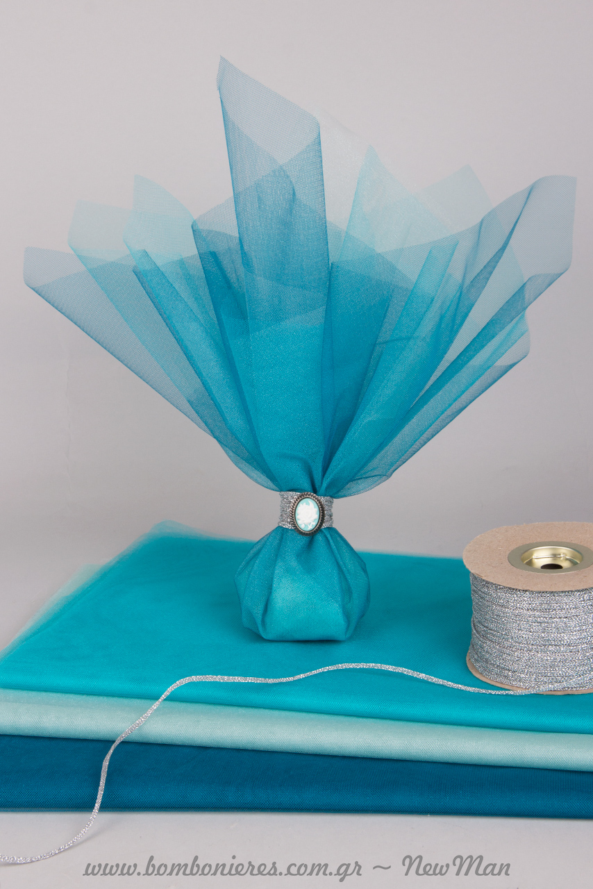 Για τη δημιουργία της θα χρειαστείτε γαλλικό τούλι κρυσταλλιζέ σε σκούρες μπλε αποχρώσεις, κορδόνι μεταλλικό πλεκτό άγριο (2mm x 100m), κουφέτα Χατζηγιαννάκης και κρεμαστά καμέο σε ένα από τα τέσσερα διαφορετικά σχέδια + χρώματά που θα βρείτε στο κατάστημα μας, Θησέως 10, Σύνταγμα ή και στα τέσσερα από αυτά.