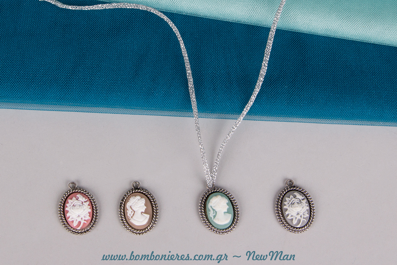 Διακοσμητικά κρεμαστά cameo με σχέδιο κυρία & τριαντάφυλλο σε 4 παστέλ αποχρώσεις: ροζ, γκρι, σιέλ. Διατίθενται σε συσκευασία των 5 ή των 10 τεμαχίων.