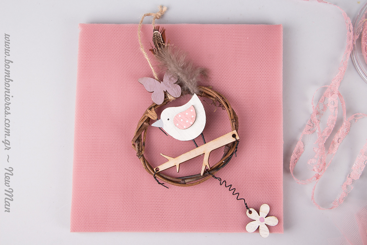 Οι ροζ λεπτομέρειες που υπάρχουν στο ξύλινο διακοσμητικό πουλάκι σε κλαδί, συνδυάζονται ιδανικά με τη ροζ κορδέλα και το τούλι, δημιουργώντας ένα αρμονικό και ρομαντικό αποτέλεσμα ενώ τα ξύλινα στοιχεία σε φυσική απόχρωση (στεφανάκι) μας συνδέουν με τη φύση και τις μυρωδιές της.