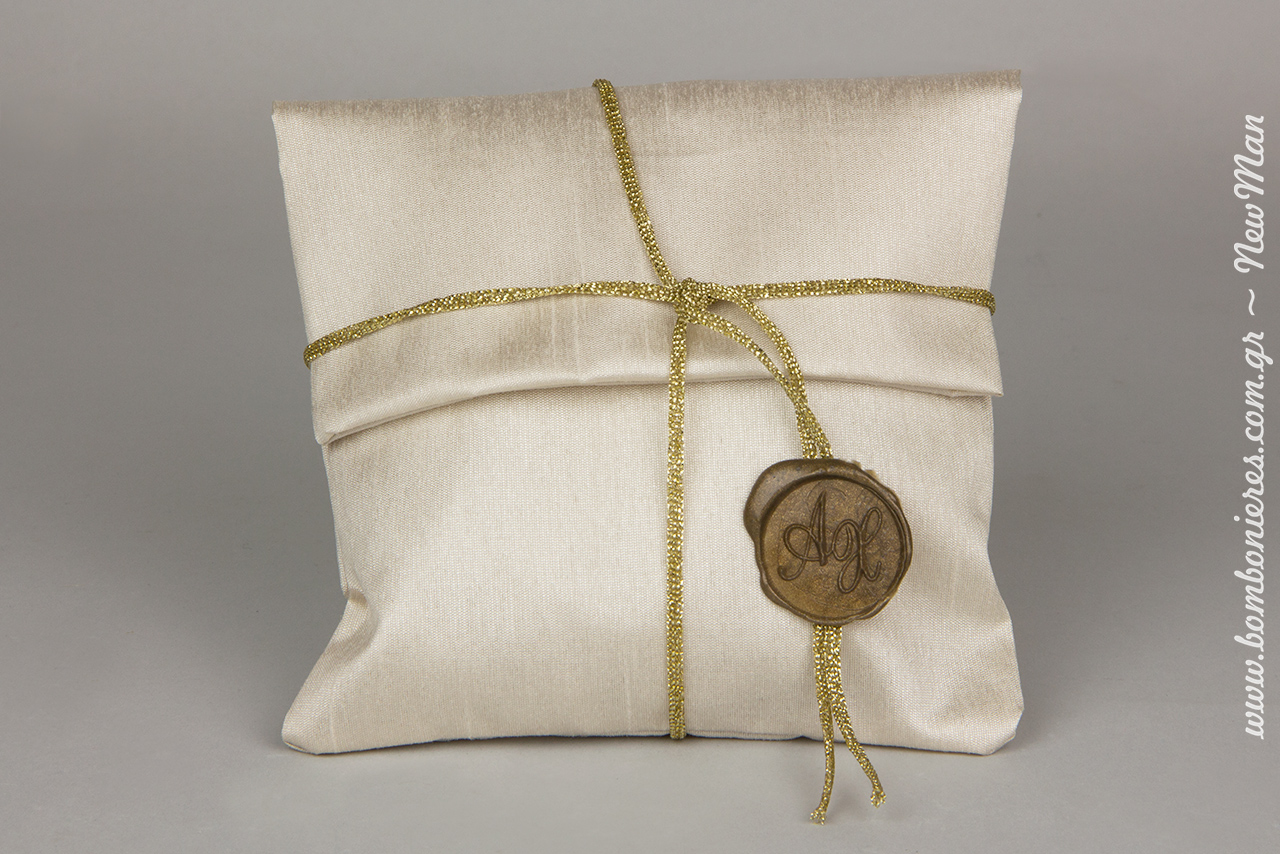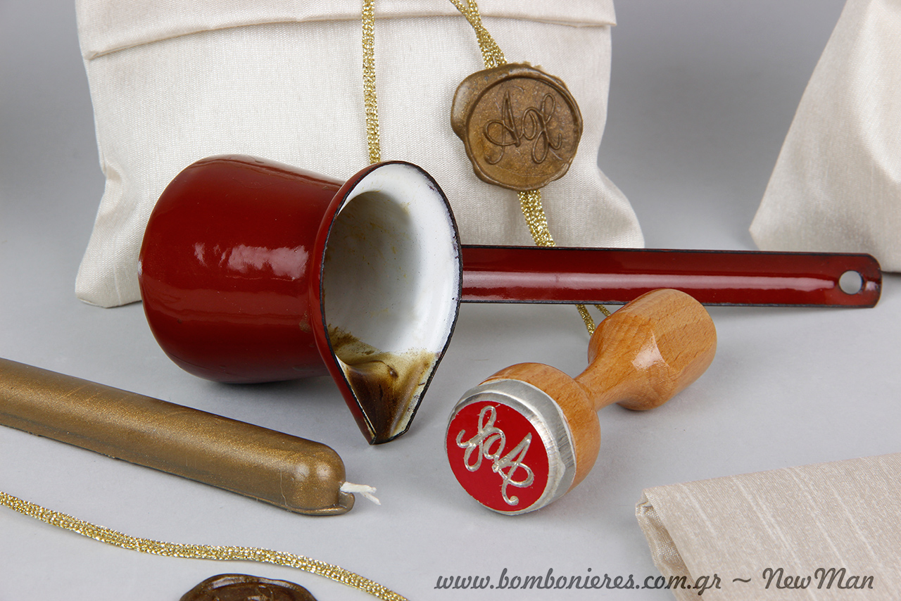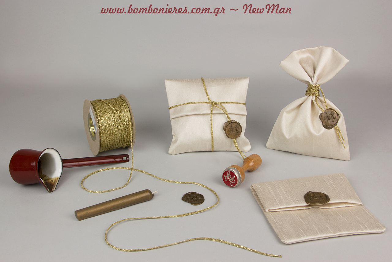 Για τη δημιουργία της θα χρειαστείτε μεταξύ άλλων: μεταξωτό πουγκί Σαντούκ, κορδόνι μεταλλικό πλεκτό άγριο, σφραγίδα και βουλοκέρι με φιτίλι μπρονζέ.