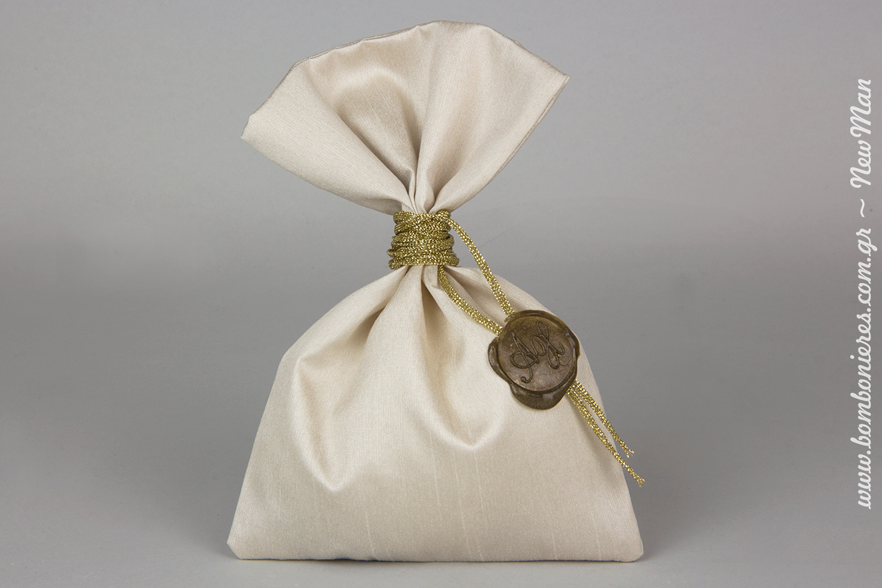 Γι’ αυτούς και για πολλούς ακόμη λόγους η Λίλιαν Νιούμαν δημιούργησε την εντυπωσιακή μπομπονιέρα σε μεταξωτό πουγκί Σαντούκ, την οποία διακόσμησε με κορδόνι μεταλλικό πλεκτό άγριο σε χρυσή απόχρωση και σφραγίδα βουλοκέρι με τα αρχικά γράμματα των μελλόνυμφων. Μια ξεχωριστή πρόταση για το ενθύμιο της σημαντικής σας μέρας που θα μεταφέρει το μήνυμα της αγάπης σας με τόλμη και κομψότητα.