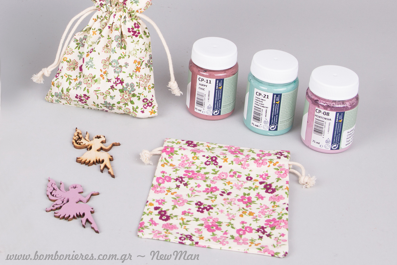 Η βάση μας είναι τα πολύχρωμα πουγκιά μας με λουλουδάκια (14 x 11cm) και διακοσμητικό, οι μικρές μας νεράιδες (6 x 8 cm), ζωγραφισμένες με chalk paint (Hortensia, Hippy Chic ή Vert Glace). Βάψτε τη νεράιδα στο χρώμα που επιθυμείτε και συνδυάστε τη με γάζα στην ίδια απόχρωση για μεγαλύτερη ένταση και καθαρότητα στη σύνθεση.