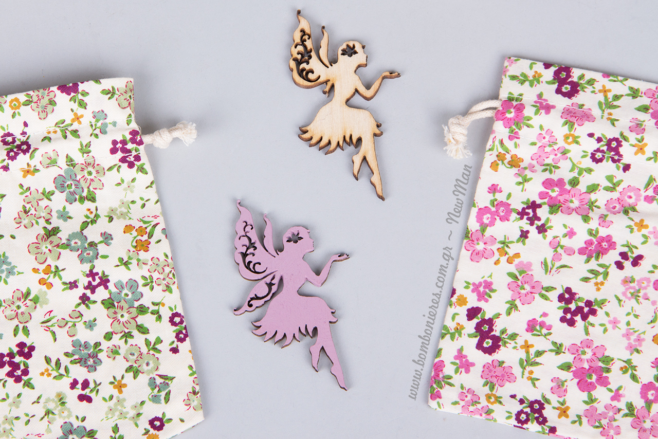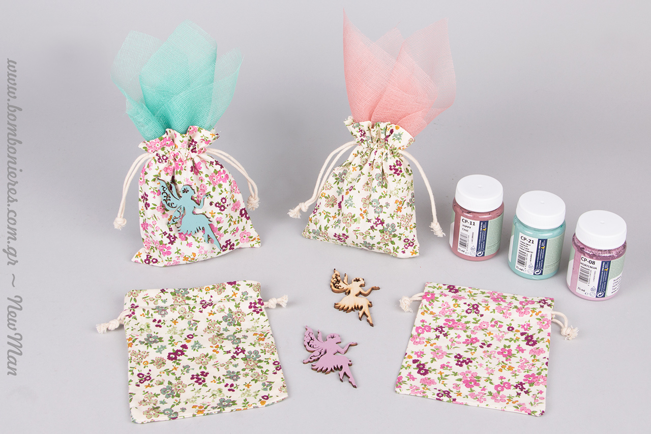Οι νεράιδες, αυτά τα υπερφυσικά μικροσκοπικά πλάσματα με την ανθρώπινη μορφή που κατέχουν την τέχνη της μαγείας κι έχουν φτερά εύθραυστα σαν της πεταλούδας, ήρθαν και προσγειώθηκαν για λίγο στις μπομπονιέρες βάπτισης που σας παρουσιάζουμε σήμερα και στα πολύχρωμα φλοράλ πουγκάκια μας. Μπομπονιέρα με νεράιδες και λουλούδια λοιπόν για την βάφτιση της μικρής σας και φτερουγίσματα μαγικά για να ‘ναι πάντα γερή και δυνατή.