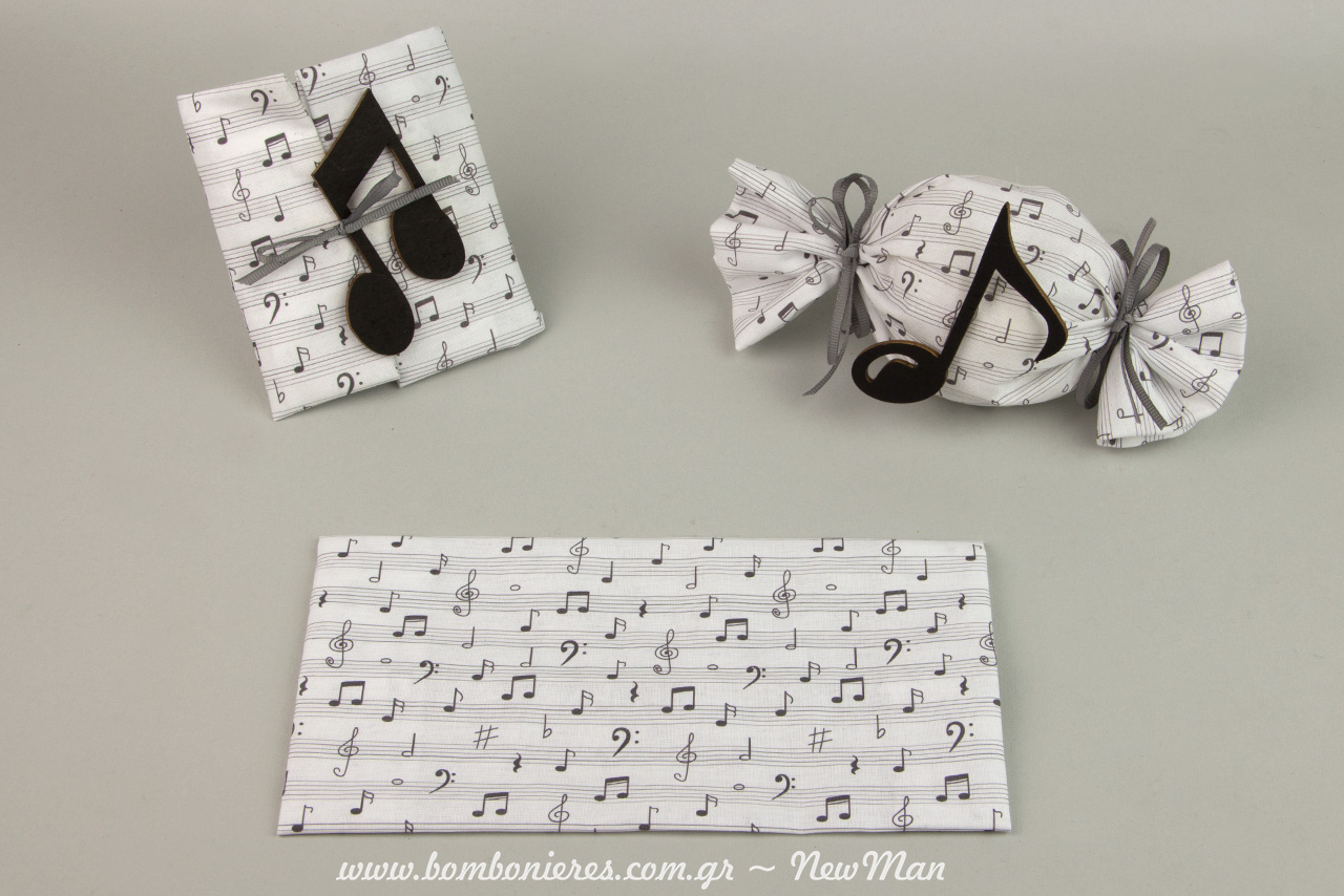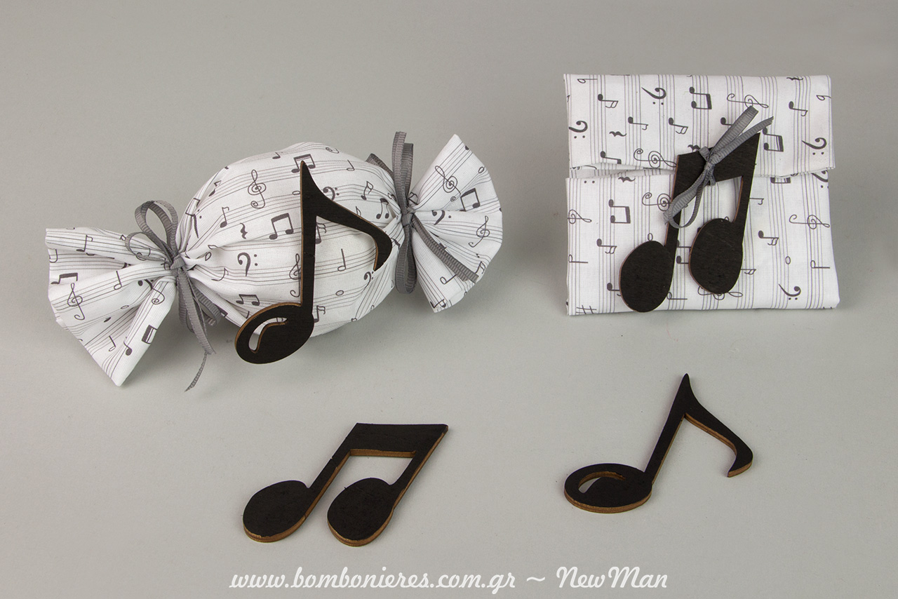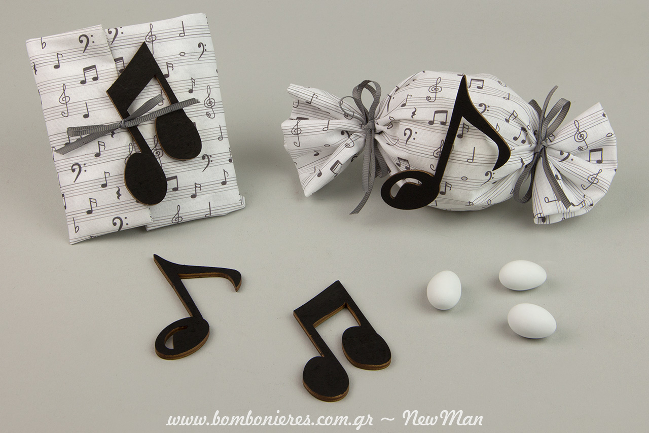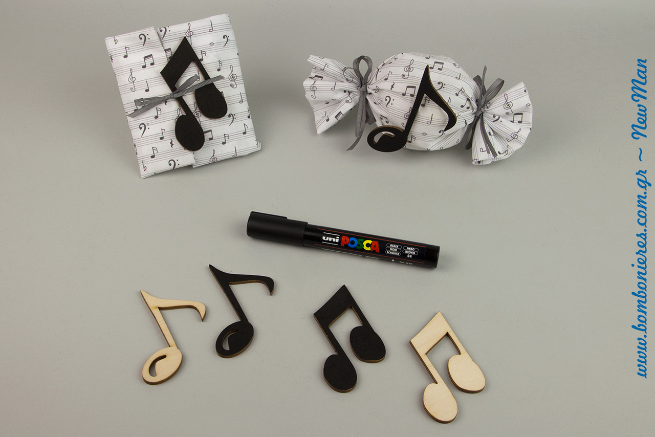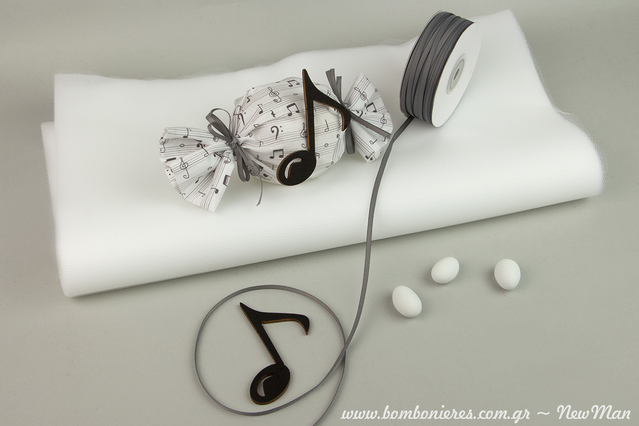 Για τη δημιουργία τους θα χρειαστείτε τα εξής υλικά: διακοσμητικές νότες (μονή – 80 x 58mm, διπλή – 80 x 50mm), πουγκί καραμέλα με νότες (το ίδιο θα χρησιμοποιήσετε και στην τετράγωνη εκδοχή), ελληνικό τούλι (39 x 39cm), κορδέλα γκρο σε γκρι χρώμα, μαύρο μαρκαδόρο Posca και κουφέτα Χατζηγιαννάκης Together, καρύδα.