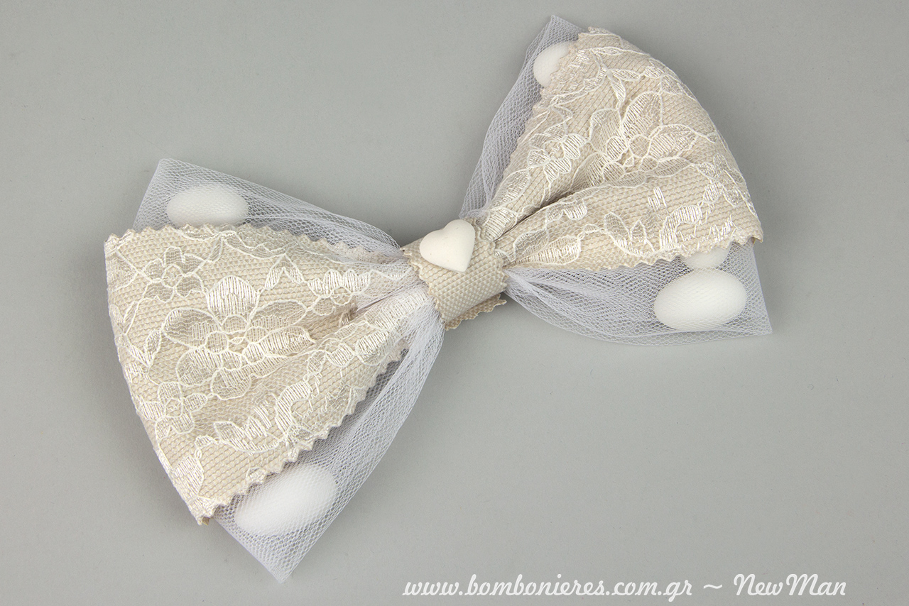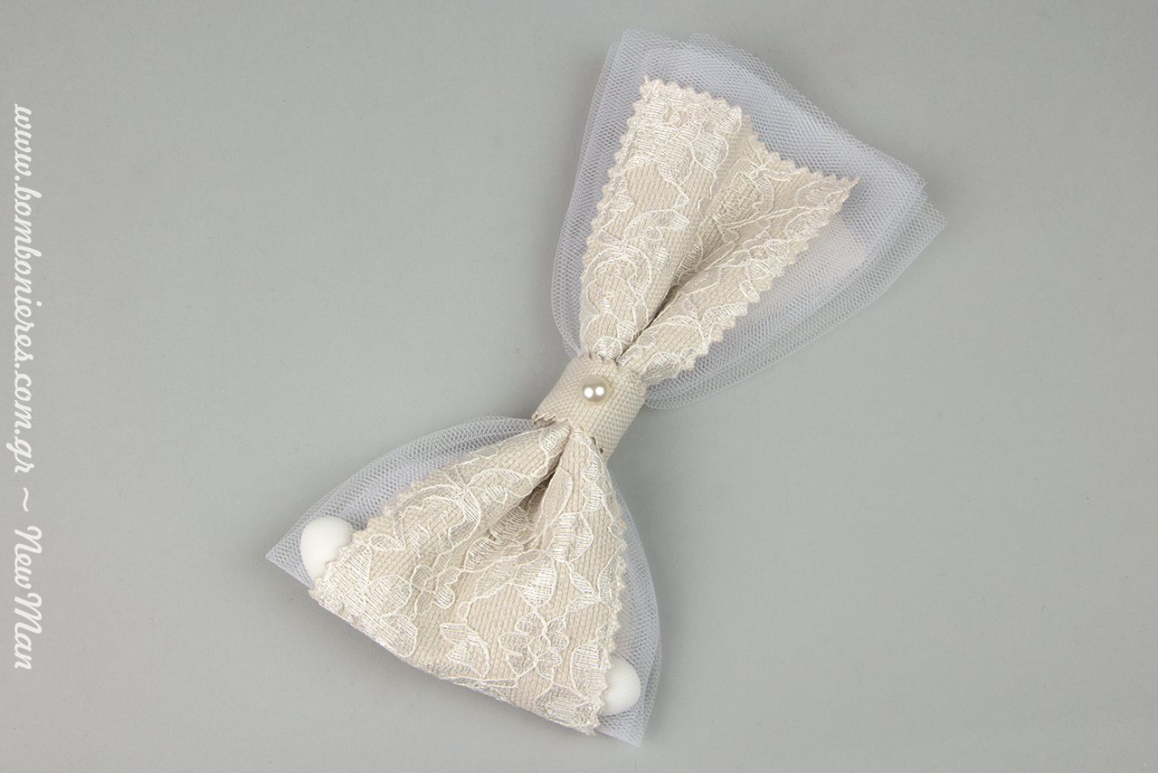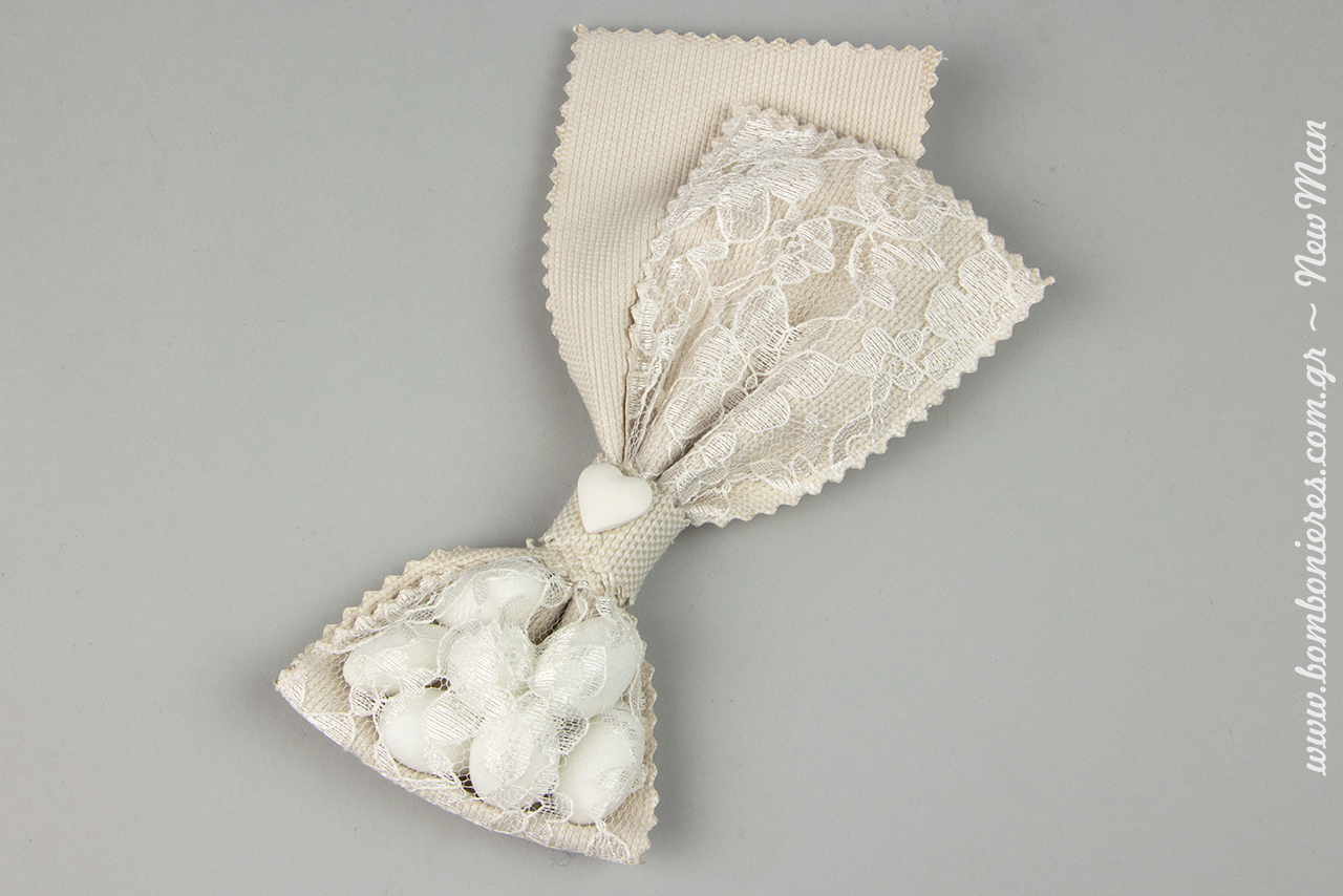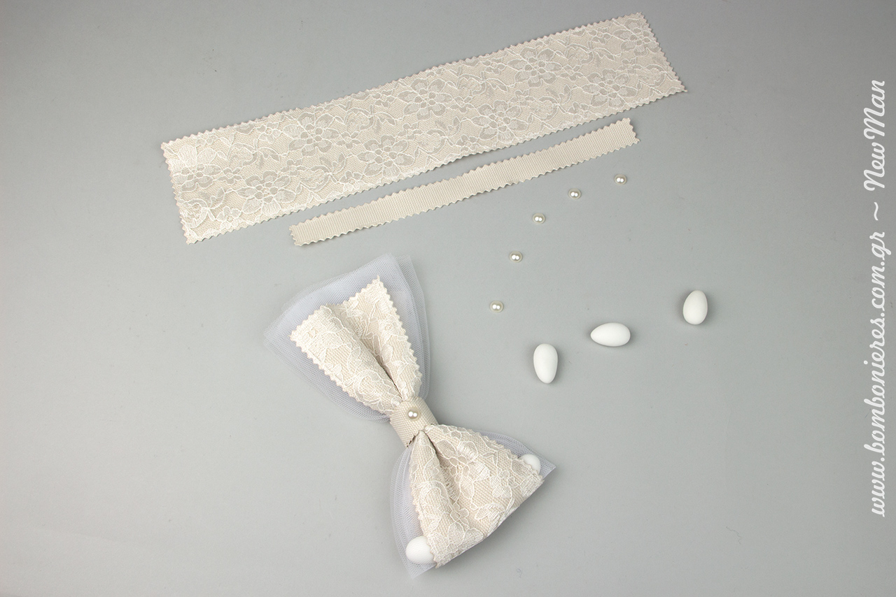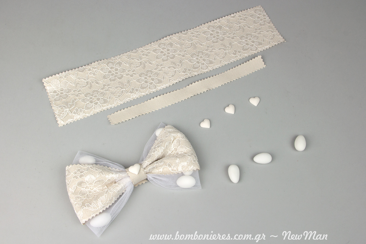 Μπομπονιέρα σε διπλό πουγκί-λουρίδα σε σχήμα φιόγκου. Για τη δημιουργία της θα χρειαστείτε επίσης γαλλικό τούλι.