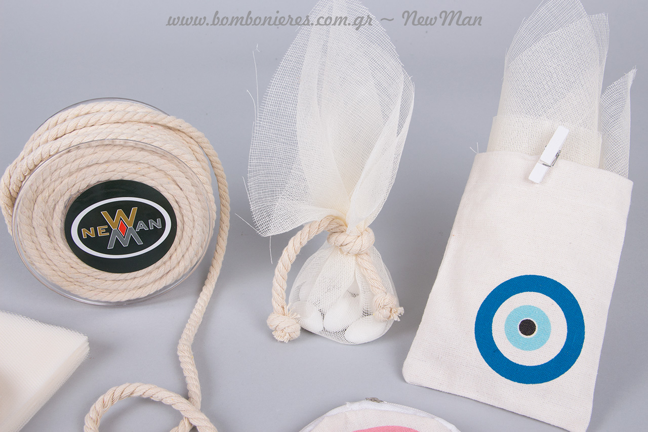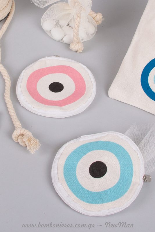 Δεν χρειάζεται να ξοδέψεις μια περιουσία για να έχεις μια πρωτότυπη μπομπονιέρα στη βάπτιση του μικρού ή της μικρής σου. Στο κατάστημα Newman, Θησέως 10, Σύνταγμα, η Λίλιαν Νιούμαν φροντίζει πάντα να φέρνει τα πιο ιδιαίτερα, οικονομικά και όμορφα υλικά. Το υφασμάτινο πουγκί- μάτι με το μανταλάκι και το πορτοφολάκι με μάτι σε τρία χρώματα (μπλε, σιέλ και ροζ), είναι χαρούμενο, φρέσκο και η ιδανική επιλογή για τη βάση της καλοκαιρινής μας αυτής μπομπονιέρας.