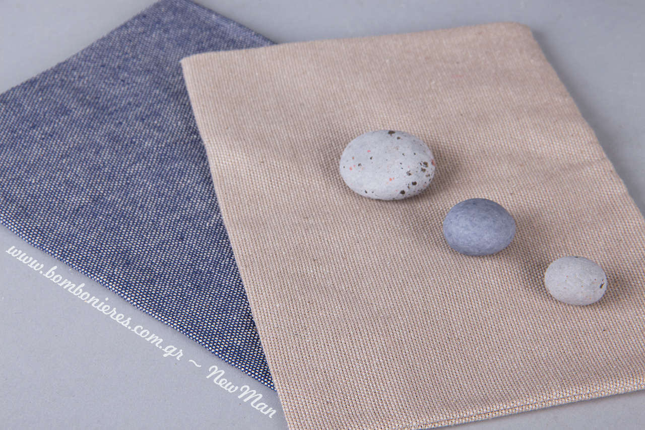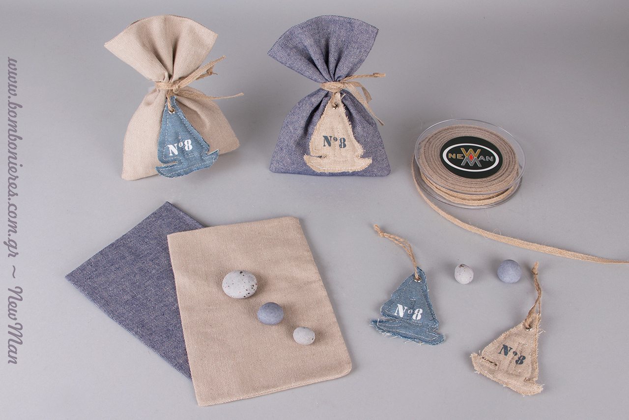 Για τη δημιουργία της θα χρειαστείτε τα εξής υλικά: υφασμάτινα πουγκάκια σε μπεζ & μπλε (13 x 18cm), υφασμάτινα καραβάκια (9 x 9 x 4cm), κορδέλα γιούτα και φυσικά κουφέτα- βότσαλα Χατζηγιαννάκης.