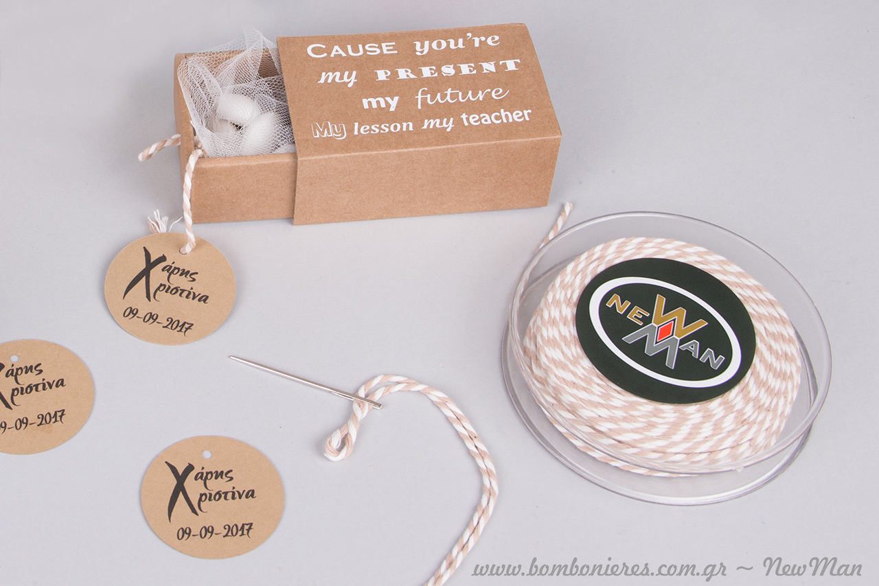 Ολοκληρώσαμε τη σύνθεση της ιδιαίτερης αυτής μπομπονιέρας με ετικέτες Eco Brown, στρογγυλές, τις οποίες σφραγίσαμε με σφραγίδα Brother, κατασκευασμένη ειδικά για την περίσταση με το όνομα του ζευγαριού και την ημερομηνία του γάμου τους. Για να τις ενσωματώσετε στο κουτί θα χρειαστείτε κορδόνι βαμβακερό και κόπτη Perfo Punch (διατίθεται στο κατάστημα).