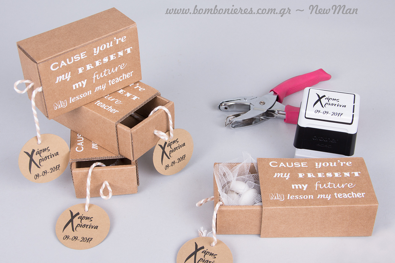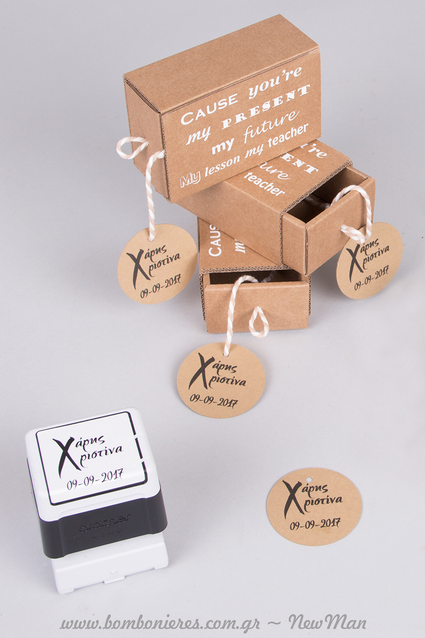 Αυτή την επιλογή έκανε ο Χάρης και η Χριστίνα τυπώνοντας τους στίχους: Cause you ‘re my present/ my future/ my lesson/ my teacher (τραγ. Ιndian moon των State Play) πάνω στο γνωστό μας συρταρωτό κουτί, τύπου σπιρτόκουτο.