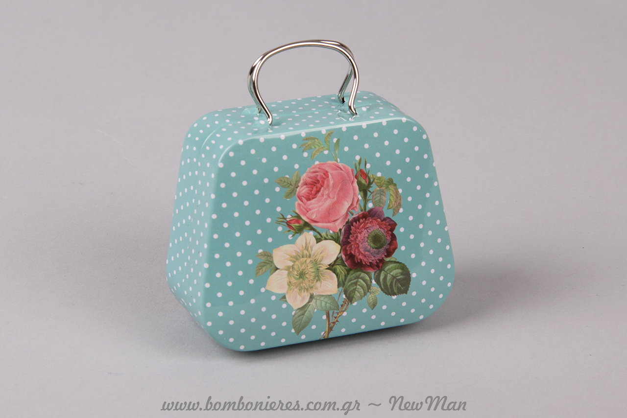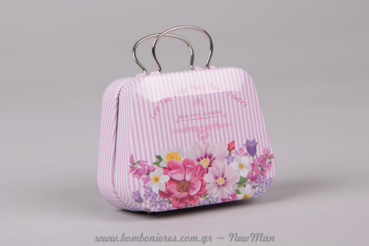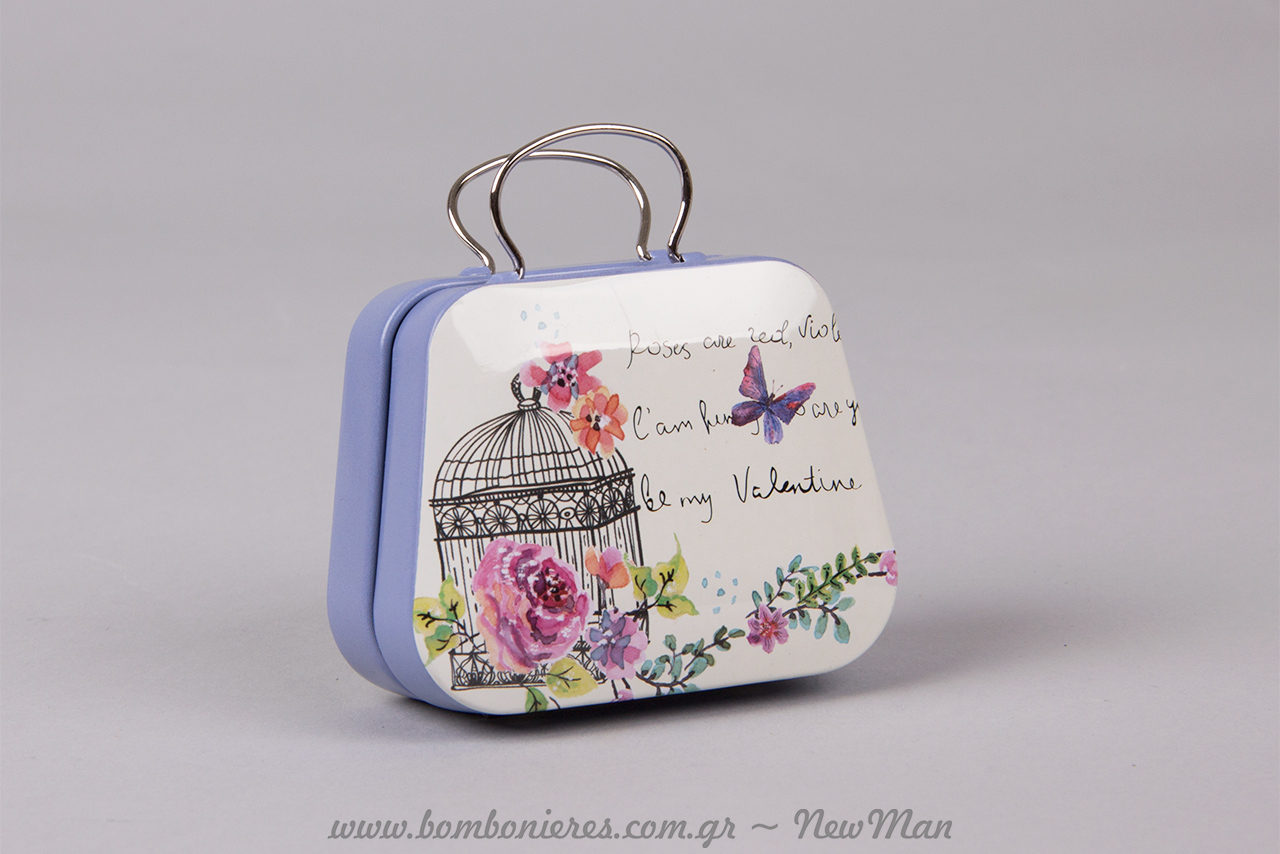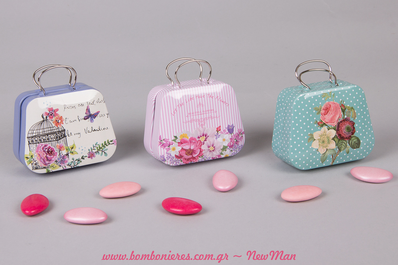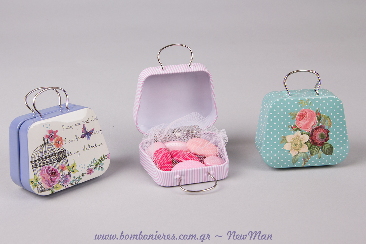 Λουλούδια, πεταλούδες, ριγέ ή πουά σχέδια και παστέλ αποχρώσεις, δίνουν στα μεταλλικά βαλιτσάκια μια ξεχωριστή ρομαντική διάσταση γεμάτη αισιοδοξία και όμορφες προτροπές όπως: Let the life have the flowers. Ιδανικά για την μπομπονιέρα του γάμου ή την μπομπονιέρα βάπτισης της μικρής σας πριγκίπισσας θα αποτελέσουν ένα υπέροχο ενθύμιο της σημαντικής σας μέρας.