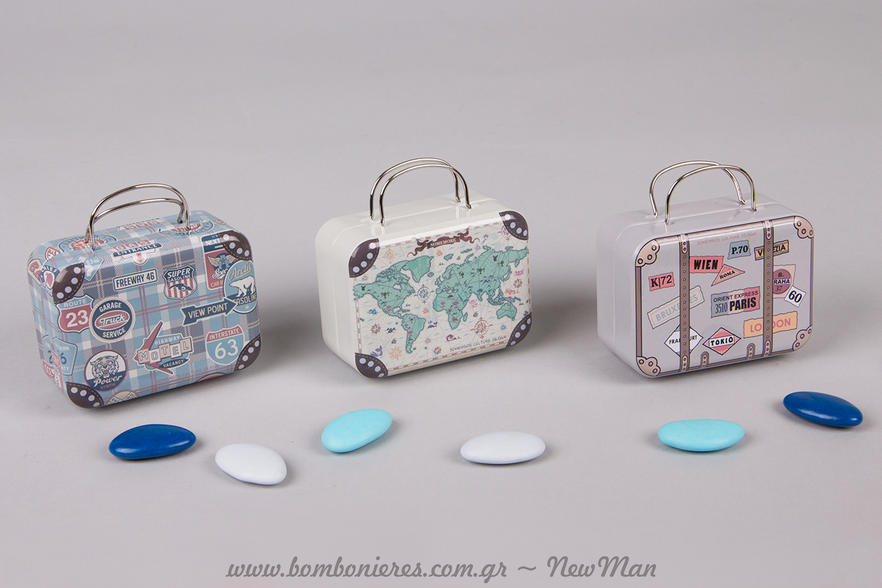 Τα μικρά, μεταλλικά/ tins σε σχήμα τσαντάκι ή βαλιτσάκι αποτελούν μια μοντέρνα και πρωτότυπη ιδέα για τις μπομπονιέρες του γάμου ή της βάπτισης. Ειδικά, αν το θέμα σας έχει σχέση με διακοπές, ταξίδια ή χώρες και περιλαμβάνει στοιχεία όπως η υδρόγειος, οι παγκόσμιοι χάρτες, τα ΜΜΜ (όπως αεροπλάνα και πλοία), θέματα δλδ που ταιριάζουν απόλυτα στην καλοκαιρινή μας διάθεση.