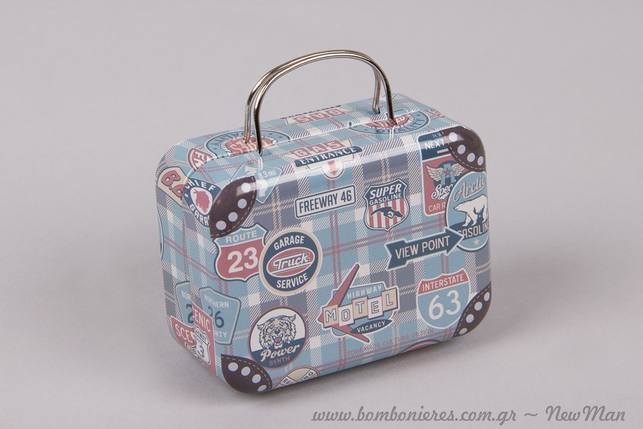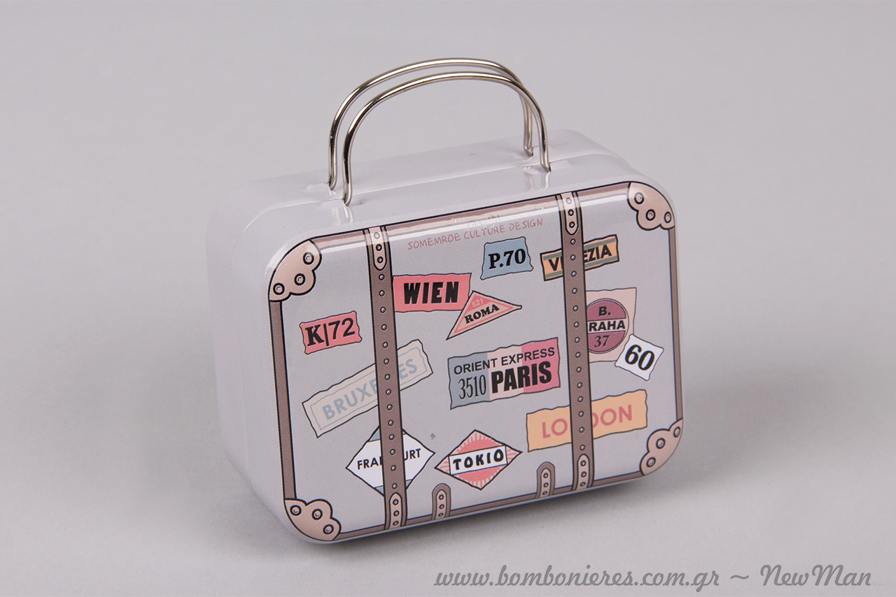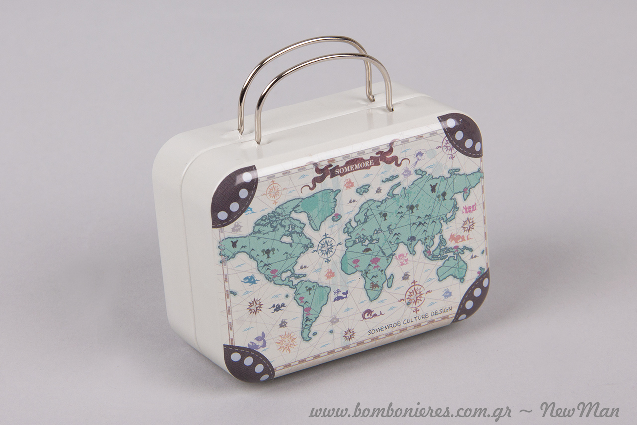 Τα μεταλλικά βαλιτσάκια σε γκρι/σιέλ αποχρώσεις με σχέδιο τον παγκόσμιο χάρτη, αυτοκόλλητα ταξιδιωτικών προορισμών και urban στυλ είναι κατάλληλα τόσο για την μπομπονιέρα βάπτισης του μικρού σας μπόμπιρα όσο και για ένα γάμο με θέμα το ταξίδι, στο οποίο θα κυριαρχήσουν ιδιαίτερα διακοσμητικά αντικείμενα όπως υδρόγειοι, γραμματόσημα, χάρτες, καρτ ποστάλ, vintage βαλίτσες κα.