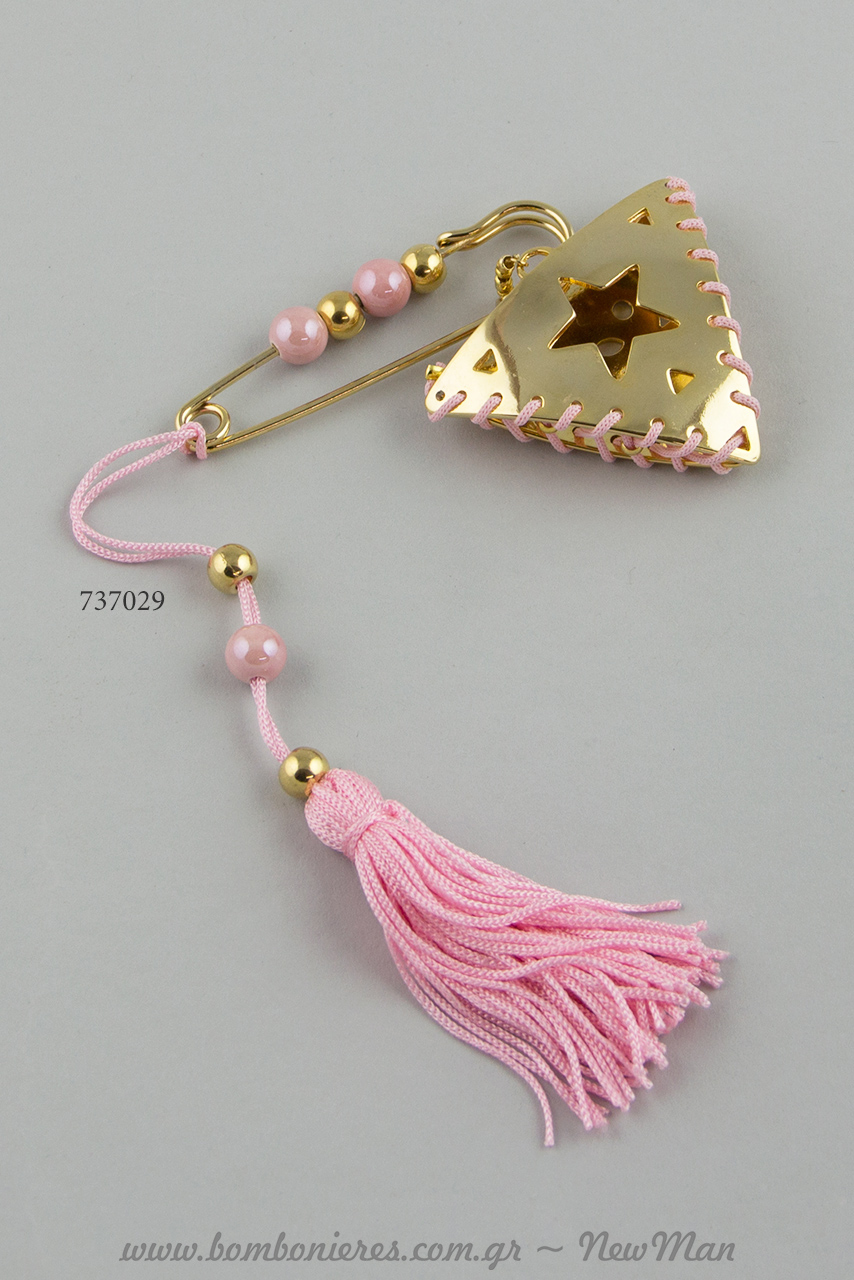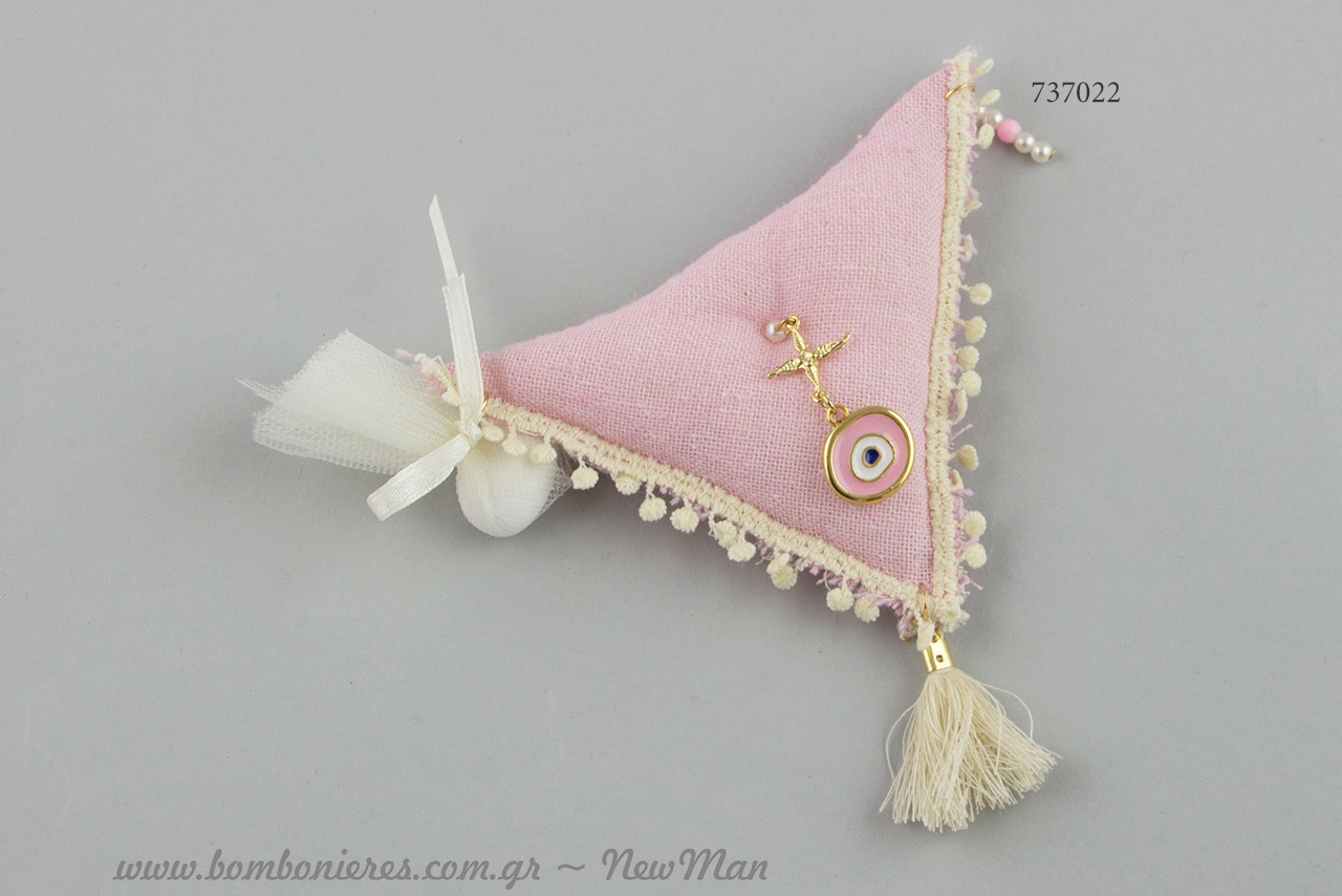 Για τη μικρή σας πριγκίπισσα επιθυμείτε φυσικά μόνο το καλύτερο γι’ αυτό έχουμε να σας προτείνουμε τρεις εκδοχές: α) το ροζ μαξιλαράκι (τρίγωνο) με ματάκι, β) το ροζ μαξιλαράκι με σχέδιο αστέρι σε χρυσαφένια απόχρωση (+ παραμάνα, χάντρες και φούντα) και γ) το φλοράλ μαξιλαράκι με πεταλούδα.