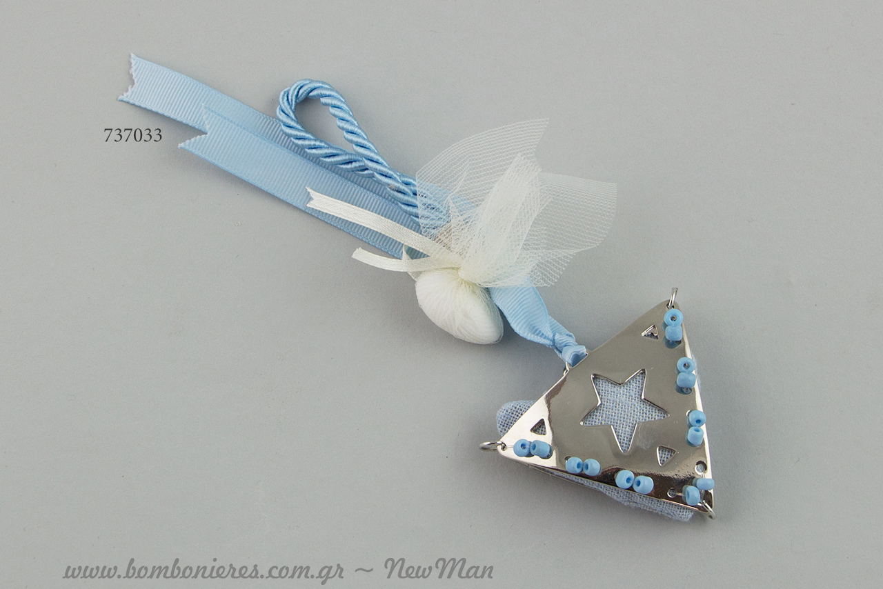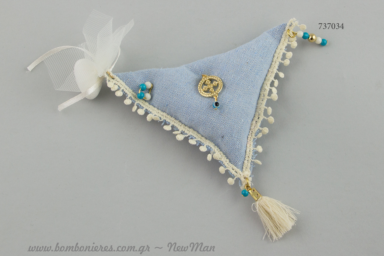 Για τον μικρό σας μπόμπιρα οι επιλογές είναι επίσης πλούσιες: α) μαξιλαράκι (τρίγωνο) με σταυρουδάκι, β) γαλάζιο μαξιλαράκι με σχέδιο αστέρι σε ασημένια απόχρωση (+ κορδόνι-κορδέλα και χάντρες) και γ) το τετράγωνο μαξιλαράκι σε μπεζ χρώμα με ματάκι, του οποίου η ουδέτερη χρωματική παλέτα ταιριάζει επίσης και σε μπομπονιέρα γάμου.