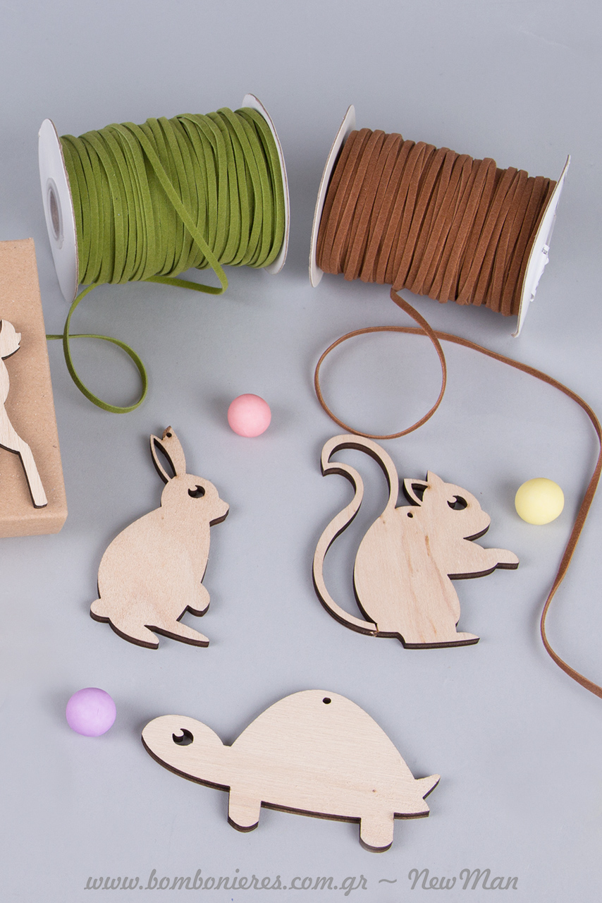 Τα ξύλινα ζωάκια (αλεπού, ελαφάκι, σκίουρος, χελώνα, λαγουδάκι, κουκουβάγια) διατίθενται σε συσκευασία των 6 τεμαχίων και σε μέγεθος 11 x 8cm, ενώ τα χάρτινα κουτάκια σε φυσική απόχρωση σε συσκευασία των 40 ή των 18 τεμαχίων αναλόγως το μέγεθος και τον κωδικό τους. Τη σύνθεση της μίνιμαλ αυτής μπομπονιέρας συμπληρώνει ιδανικά το suede κορδόνι σε πράσινη ή γήινη καφέ απόχρωση, με το οποίο θα «δέσετε» και τα ζωάκια στο σώμα του κουτιού.