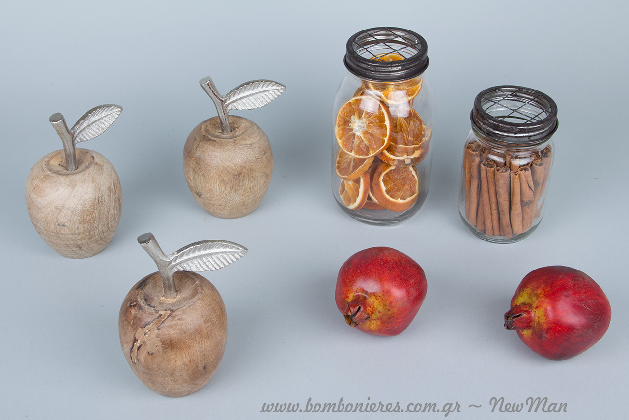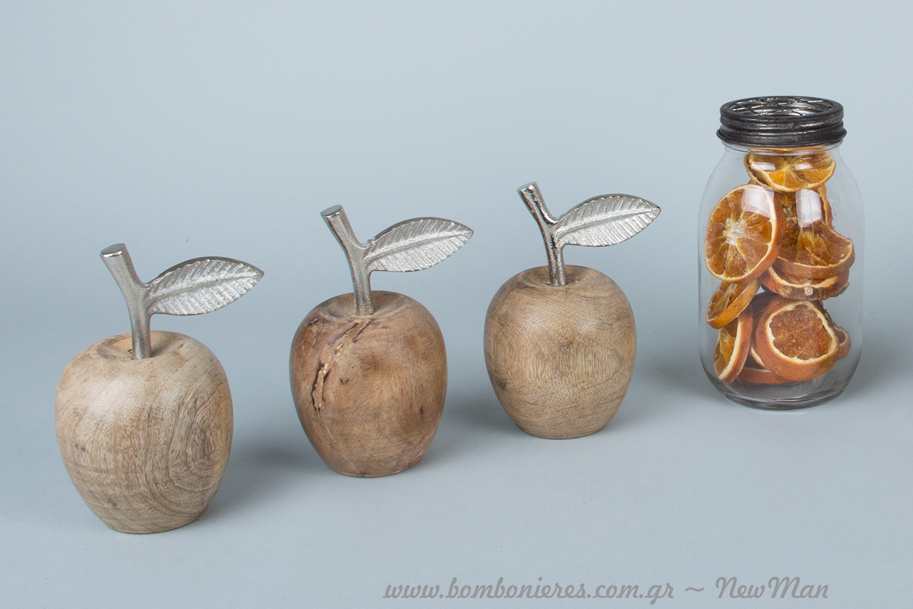 Υπέροχα ξύλινα μήλα με μεταλλικά φύλλα (15 x 11 x 9cm) και βαζάκι με αποξηραμένα φρούτα (διατίθενται σε συσκευασία των 250gr).
