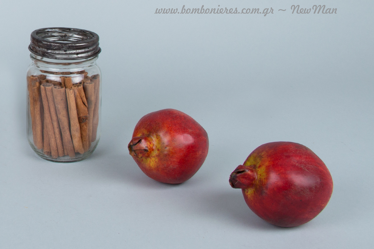 Διακόσμηση με γυάλινα βάζα (μεταλλικό καπάκι), αποξηραμένα φρούτα, κανέλλα και ξύλινα μήλα ή κόκκινα ρόδια.