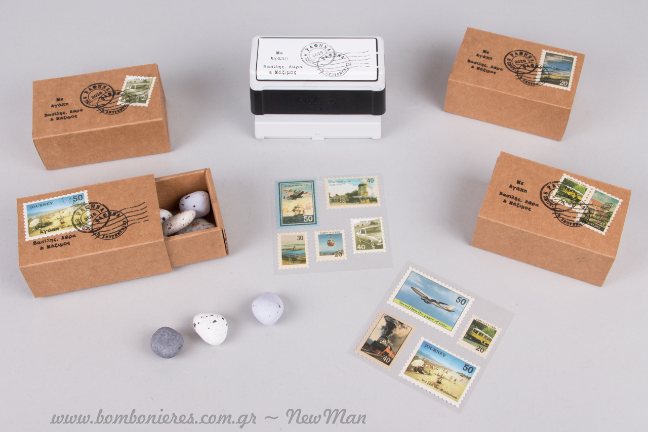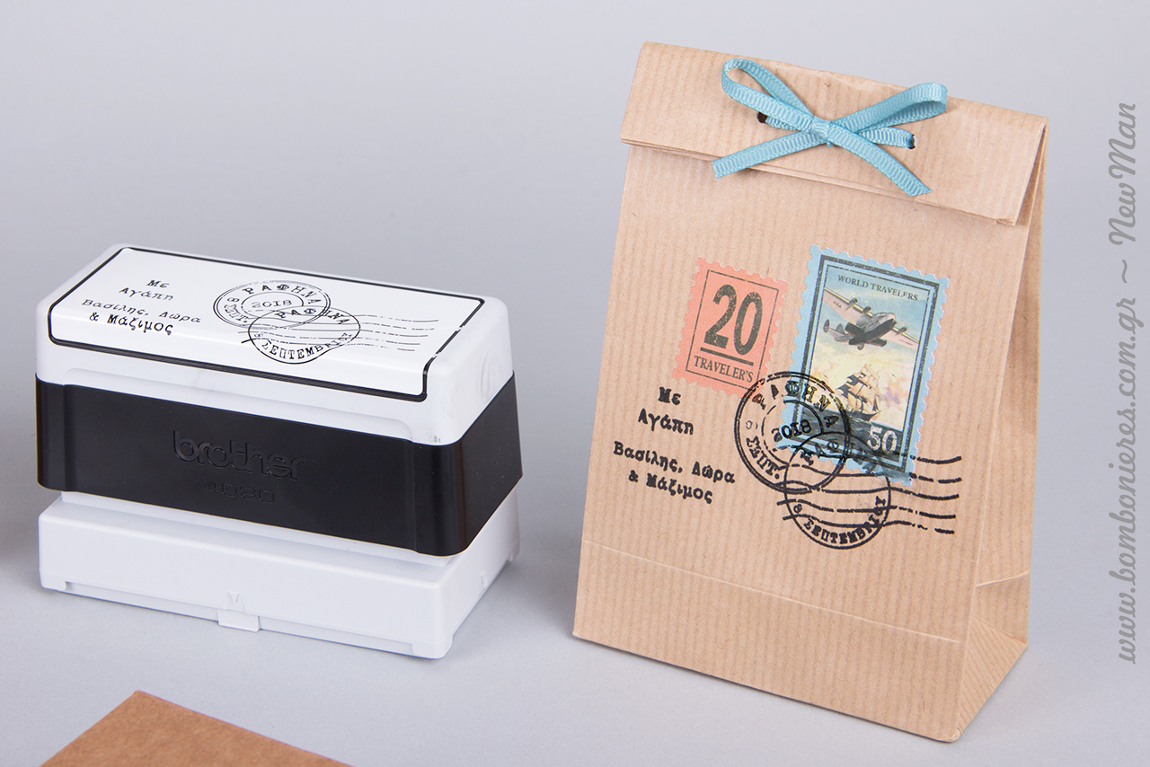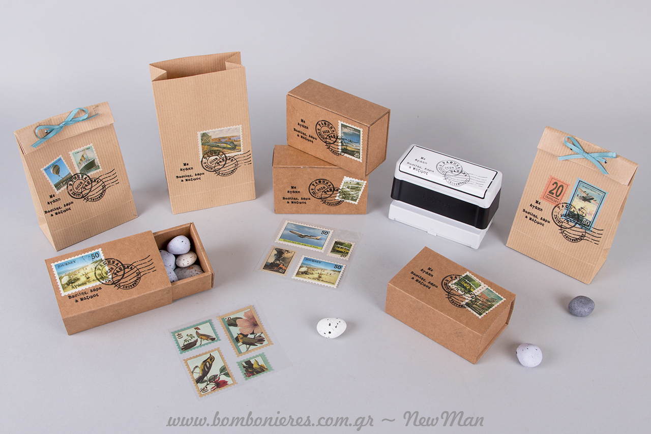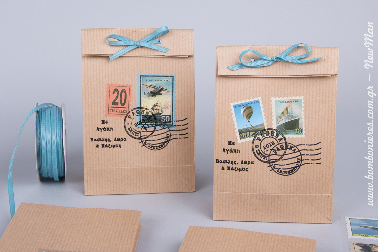 Ταχυδρομικές/ταξιδιωτικές μπομπονιέρες σε τσάντα φάκελο Kraft No 1 (95 x 165 x 50mm) ή σε χάρτινο οικολογικό κουτί Kraft (παραγωγής Newman), διακοσμημένες με χάρτινα γραμματόσημα σε διάφορα σχέδια, κορδέλα γκρο (γαλάζια) και προσωποποιημένες σφραγίδες Brother.